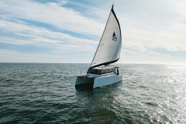 The HopYacht 30, designed by naval architect Anton Du Toit, occupies a unique niche. It offers the stability of a catamaran with the beam of a monohull, allowing it to fit into standard slips. While ideal for a couple, the aft cockpit table can be lowered and converted into a spacious daybed. With t
