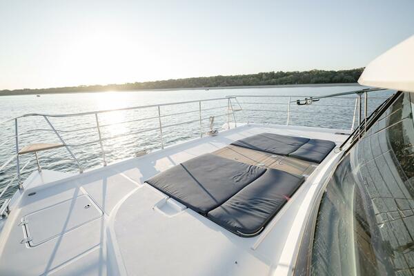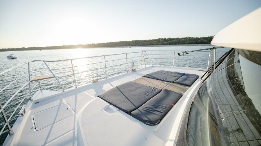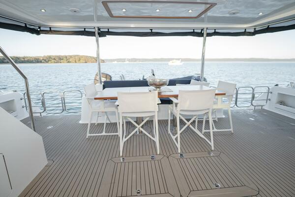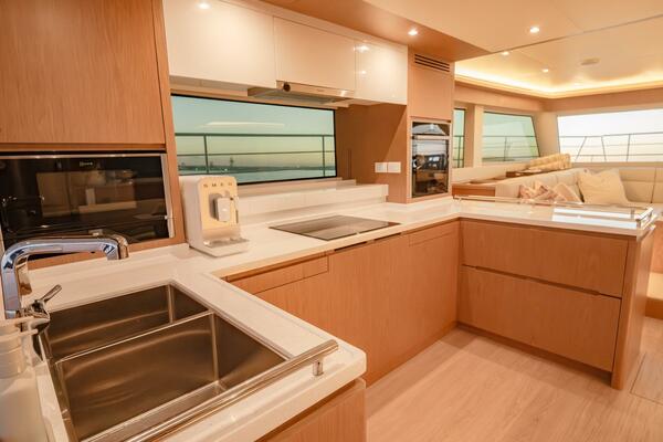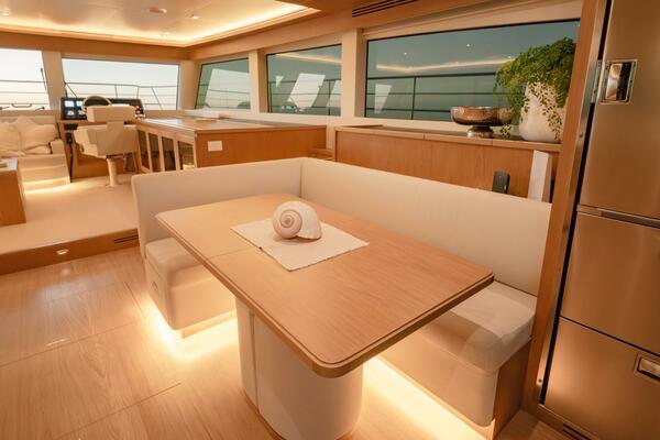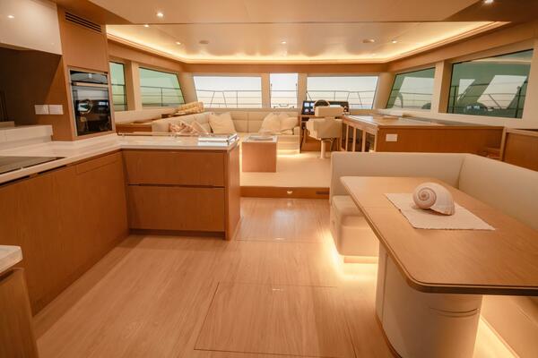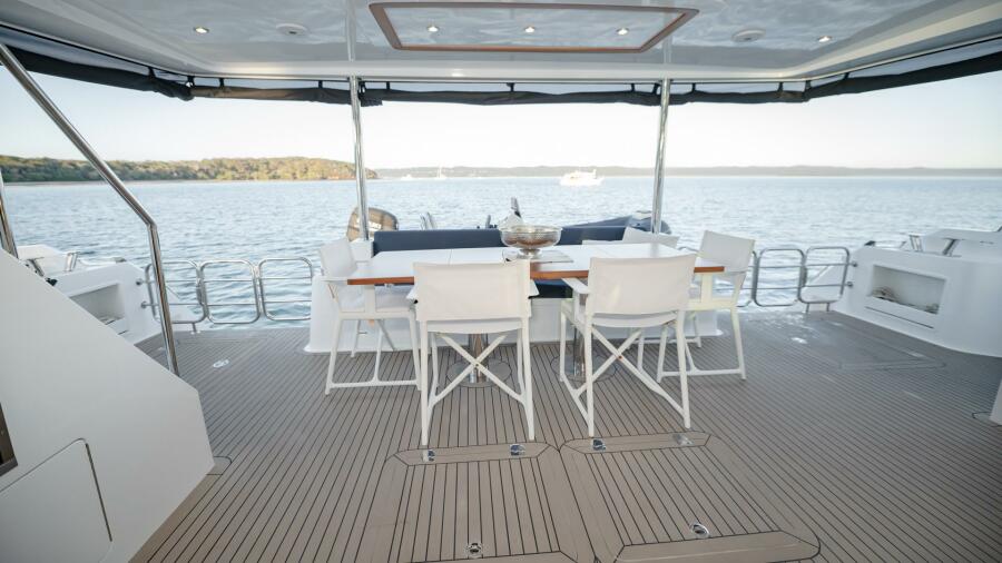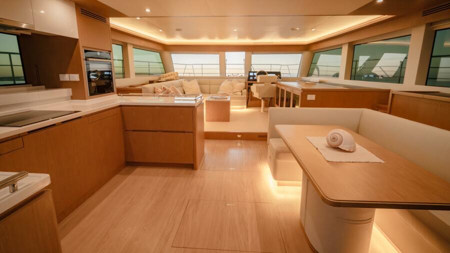 The main saloon and galley are awash with natural light through large windows, providing excellent visibility for the helmsman at the lower starboard helm station. The L-shaped lounge offers a comfortable retreat from the galley and cockpit, while vast sliding doors integrate the saloon with the alfresco cockpit. Features include a foldable teak dining table for 8–10 guests, an extra cockpit fridge, and generous swim platforms on each hull for safe boarding and water access.