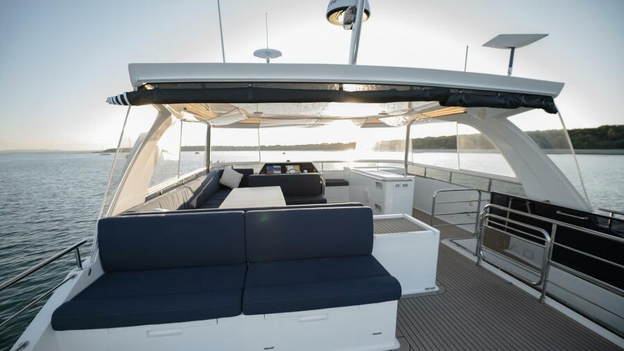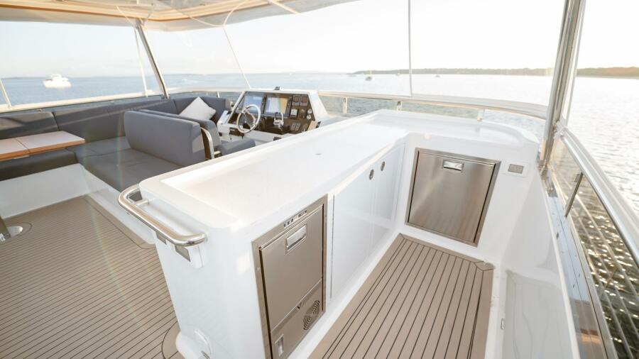 The expansive 31m² flybridge offers an L-shaped bar with icemaker, drinks fridge, lounge and dining area, and commanding helm station. Aft, a custom bench seat and BBQ area provide the perfect space for entertaining while remaining connected to the action.