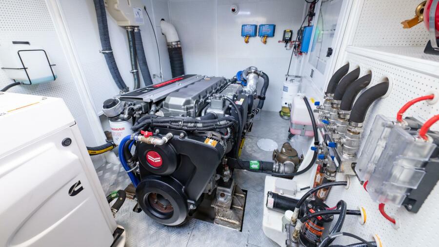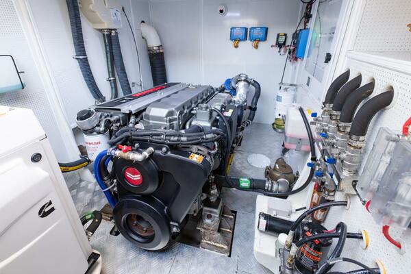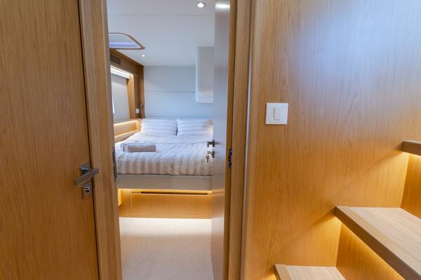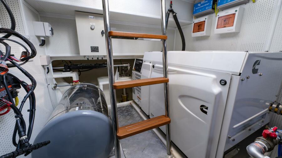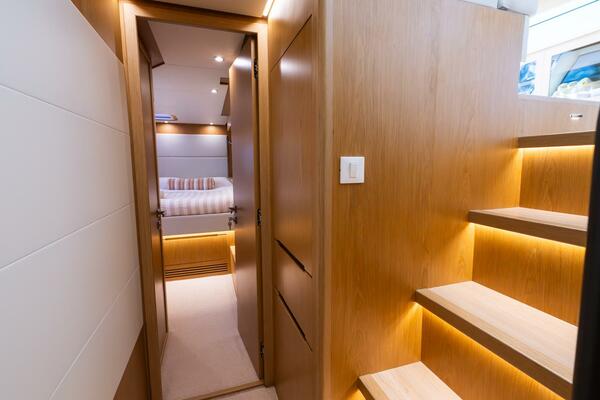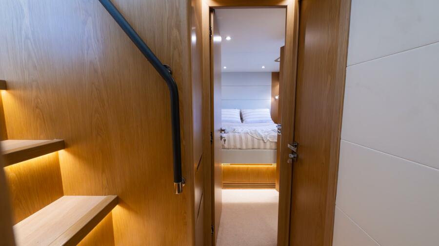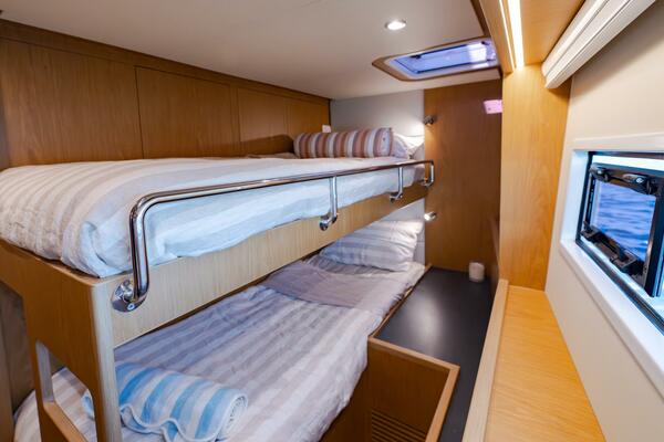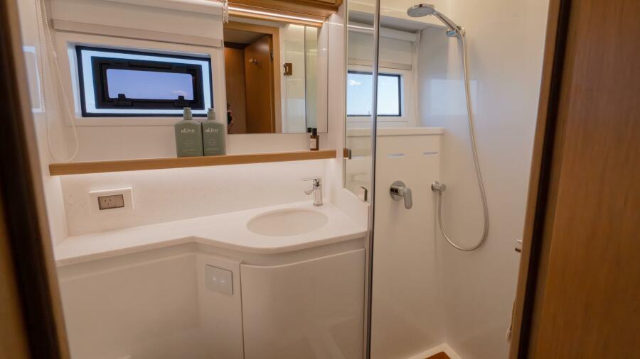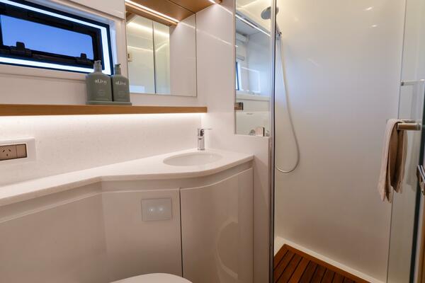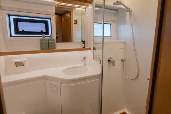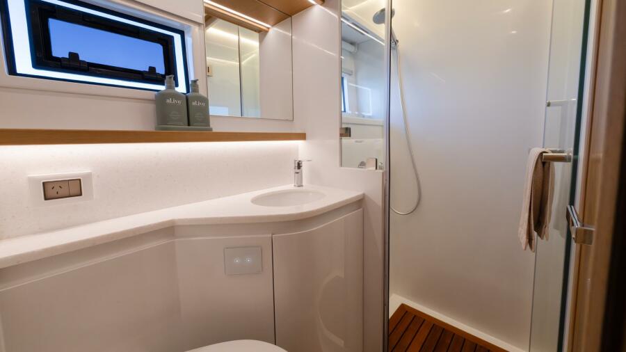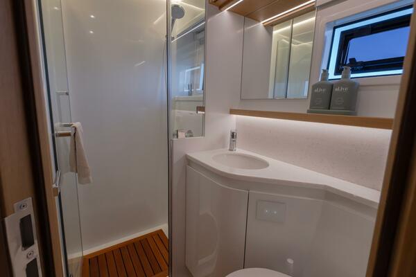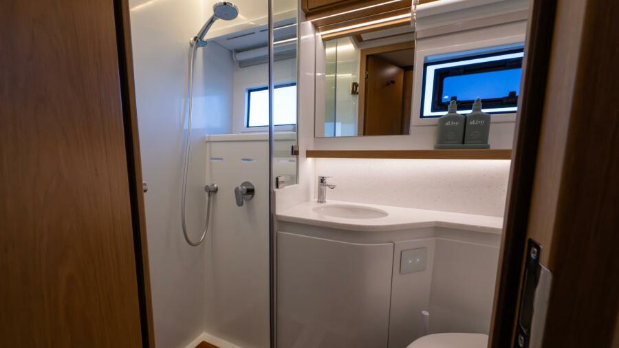 Her clever four-cabin layout is ideal for families or groups of friends. Each cabin has its own ensuite, with twin bunks forward on the starboard side and two spacious aft cabins, the port aft serving as the master. Ample storage ensures comfort for extended cruising.