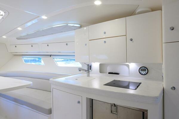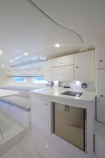 - Hi/Lo electrically actuated cabin v-berth table with filler cushion • Hull side windows with blinds creates secondqueen birth