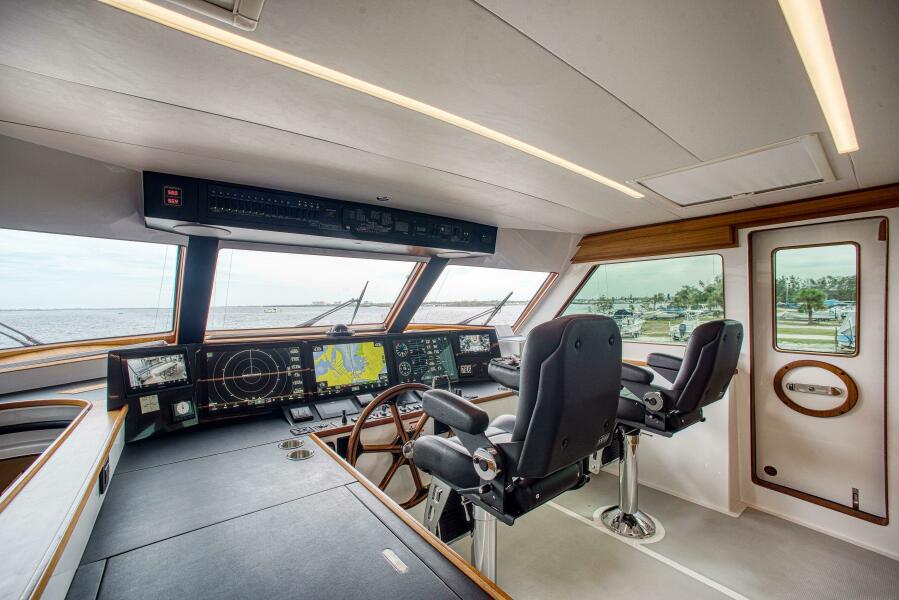 The vessel features a fully enclosed, climate-controlled command bridge. The helm features 3 main 24" navigation displays and a smaller multifunction screen port and starboard for any desired information. The dash itself and the surrounding area have been finished in a matte black and black carbon fiber This is the best finish for those that run long distances at night because it reduces glare. Overhead you find all the information displays to operate he vessel. You can monitor the batteries, tanks, stabilizers and directly overhead is a diagram of the yacht that shows safety alarms for high water, high exhaust temperature and even the status of the engine room and engine room doors.