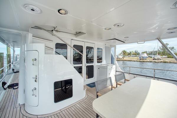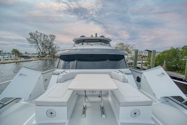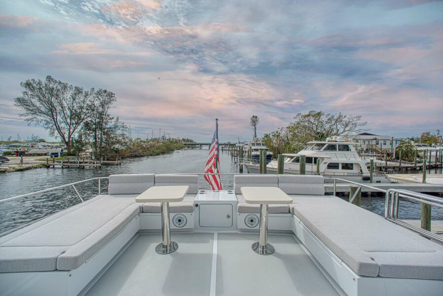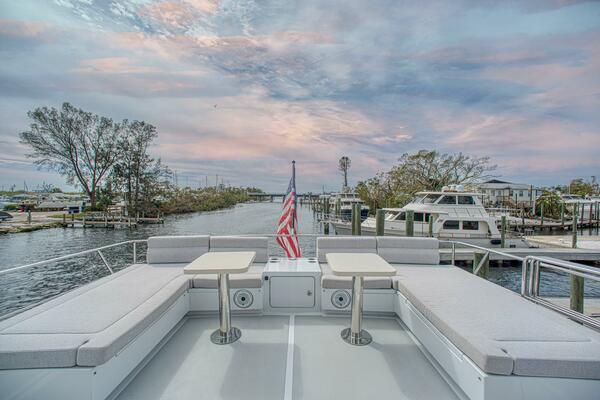 Once you exit the command bridge aft door you find a large seating space. There is a full beam U shaped area aft and a nice bench and table forward by the door that is under the protection of the command bridge hard top. This is a great entertaining area and has a large sun shade that can be installed easily. There is a 24 can drawer for beverages under the seating unit.