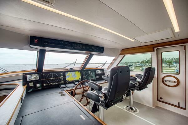 The Spacious Galley forward with center island provide expansive counterspace. The well-appointed galley is equipped with amenities tailored for culinary enthusiasts and chefs alike. Enjoy breathtaking panoramic views through the expansive forward windows. Two overhead hatches and the Port Pilothouse door can be opened when the weather allows.
