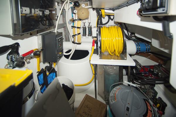 A large hatch in the floor provides access to a large well lit storage area. This space houses the fresh water system that includes 3 Head Hunter 120VAC fresh water pumps. Two units serve the fresh water system in the boat and the third if for the high pressure washdown spigots outside for washing the boat.