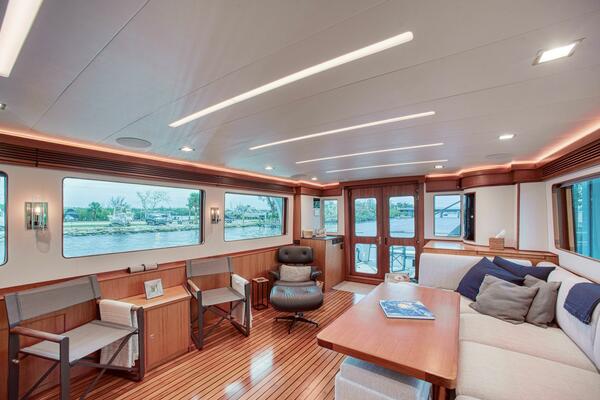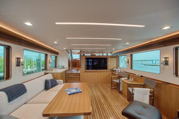 Step into the salon and be welcomed by the stunning satin teak woodwork complemented by a Satin teak and Ebony sole. Expansive panoramic windows flood the area with natural light, creating a warm and inviting atmosphere. On the Port side, a built-in settee and oversize coffee table with ottomans. The salon has a Sub Zero beverage center, ice maker and wine cooler and ample storage for glassware and bottles. The 75" tv is forward and swings out to reveal the Savant entertainment system. The upper half of the walls in the salon have been finished in a soft white material that really brightens the space compared to an all teak interior. The overhead lights and wall sconces have a bit of a modern flair. The yacht is simply stunning.