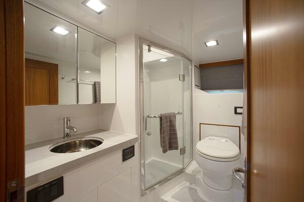 The spacious VIP stateroom features a King berth on centerline. Guests can enjoy the comfort and luxury of a private ensuite head with a generously sized shower. A large overhead skylight is on the centerline create a bright and welcoming atmosphere that ensures guests will feel pampered and at ease during extended trips on the water. There are port and starboard hanging lockers and 6 storage drawers below the berth. The stateroom and a very large overhead portlight for natural light and features a toilet with Bidet function and large shower. The headboard is the entire forward wall and is covered in beautiful fabric panels and accented by wall sconces.