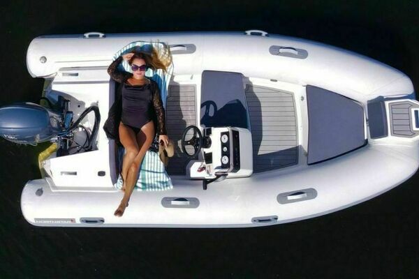 Standard features include an ergonomic console, an electrical system with a switch panel, LED navigation lights, an all-around white light, and an automatic bilge pump, an acrylic glove box with a USB charge port and a main cutoff switch, hydraulic steering, a replaceable transom for short or long shaft engines, Hypalon tubes, a self bailing deck, and marine upholstery.