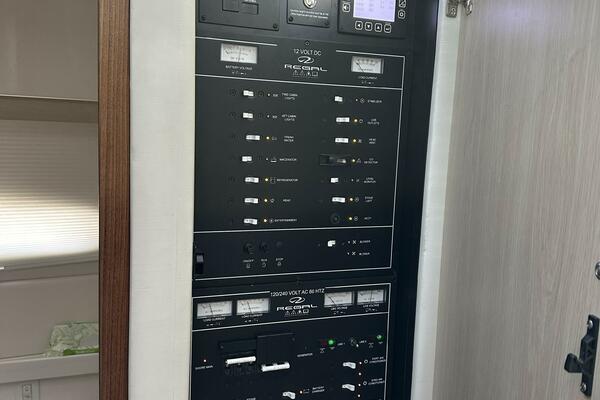 THE REGAL 38 FXO IS ONE OF THE MOST VERSATILE VESSELS OFFERED IN TODAY'S MARKET. TO FIND AS MANY FEATURES IN A 38 FOOT VESSEL IS QUITE REMARKABLE. TO START, THERE IS A FULL BEAM AFT CABIN WITH A QUEEN SIZE SLEEPER. THE MASTER STATEROOM IS FORWARD WITH A RAISED QUEEN ISLAND BERTH. THERE IS A SPLIT LOCKER HEAD AMIDSHIP. THE HEAD AND SINK TO STARBOARD AND TO PORT A SEPERATE FULL SHOWER LOCKER WITH A BUILT IN SEAT. THE FXO'S GALLEY/ SALON HAS SEATING FOR SIX, A NICELY APPOINTED GALLEY, SOFA, AND LOVE SEAT LIKE SEATING WITH A DROP-DOWN TV IN AN OVERHEAD COMPARTMENT. THE LOWER HELM TO STARBOARD IS EQUIPPED WITH FEATURES THAT ARE TYPICALLY FOUND IN A MUCH BIGGER YACHT. THE HELM FEATURES A TWIN SCREEN GARMIN PACKAGE TO INCLUDE GPS NAVIGATION, RADAR, YAMAHA ENGINE CONTROLS ALONG WITH A JOY-STICK CONTROLLER AND A BOW THRUSTER. THE FLYBRIDGE HELM IS A DUPLICATE OF THE LOWER HELM AREA AND ADDITIONALLY OFFERS A BIMNI TOP, SEATING FOR 7, AND A SMALL REFRIGERATOR. THERE IS A FIBERGLASS MOUNTING BRACKET FOR THE SAT TV ANTENNA AND THE CLOSED DOME RADAR ANTENNA.