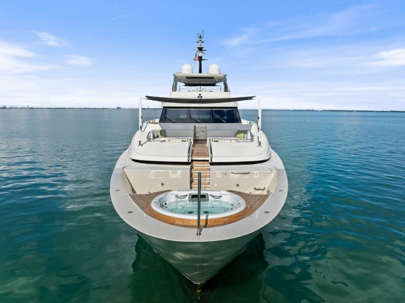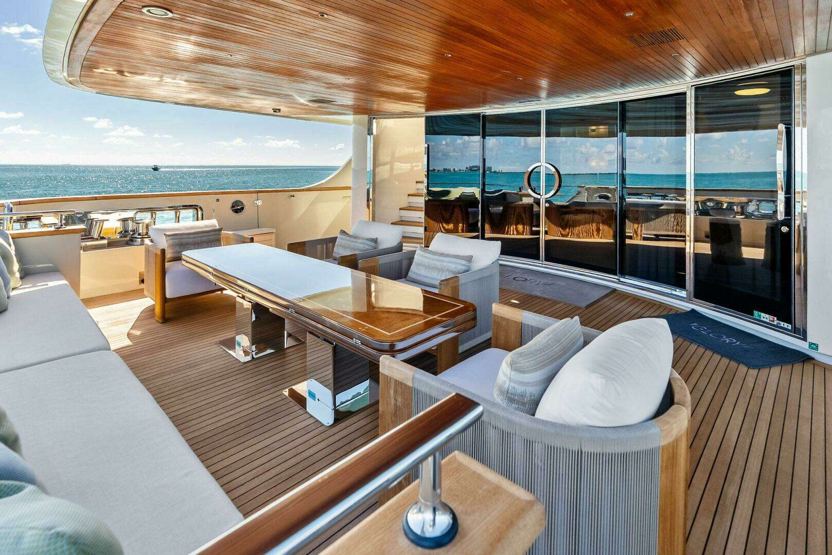 The main salon offers an inviting ambiance, combining a refined lounge space in "cooling" pale woods with elegant dining forward. Both the skylounge and main salon showcase contemporary luxury with their light wood flooring, sophisticated finishes, and neutral soft furnishings, accentuated by ample natural light streaming through expansive windows or enhanced by atmospheric lighting. Forward of the pilothouse is yet another outside lounging area, consisting of two L-shaped seating areas, each with a cocktail table (all of which can be shaded), leading to another Jacuzzi on the bow. GLORY is in immaculate condition, bottom recently painted (Oct 2025). Ready to go cruising!