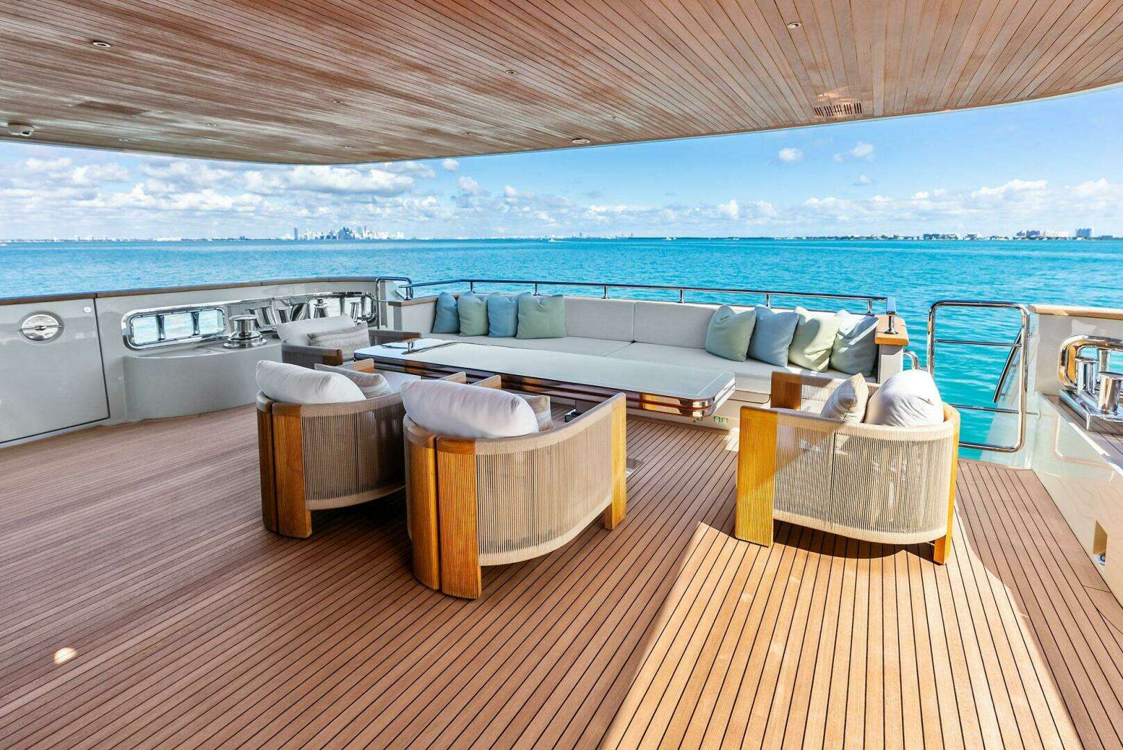 This vessel exudes elegance and sophistication with great outdoor entertaining areas. Her spacious triple-deck layout includes an expansive sundeck featuring an on-deck jacuzzi under a louvered sunroof, a full-service bar, along with ample sunbathing and lounging areas, which can be shaded. For a more casual dining experience with panoramic views, the skylounge deck aft offers covered dining for up to 12 while the main aft deck sets the stage for leisurely mornings or evenings, with an electric hi-lo coffee table (2025) that also converts to a dining table.