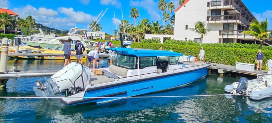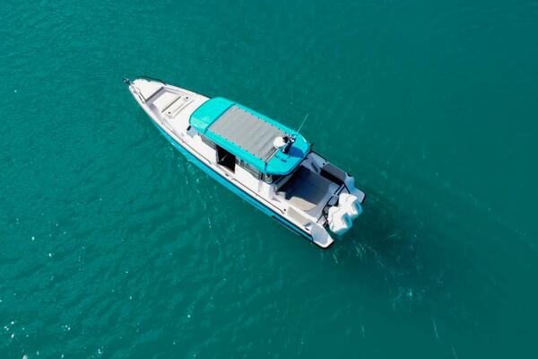 024 Axopar 37 Cross Cabin with Brabus package and Mediterrana Edition. Featuring a brilliant Miami Blue hull with White Mercury 350 V10 Verrados, equipped with 1300 AH Lithium ion battery.