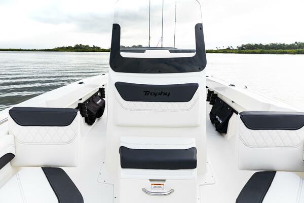 Standard amenities include a self-bailing cockpit, a leaning post with an aerated livewell, insulated fish boxes, and gunwale rod holders. The cockpit is equipped with a waterproof 120-watt AM/FM stereo with Bluetooth capability, and the helm features multi-function gauges with fog-resistant glass lenses. With its combination of fishing features and family-friendly design, the Bayliner Trophy T22CC is an excellent choice for those seeking a well-rounded boating experience.