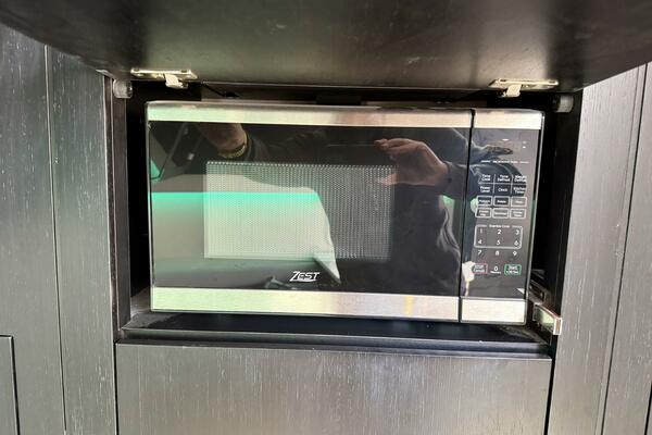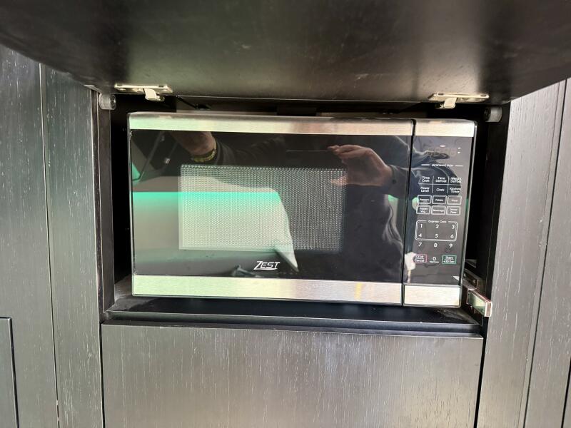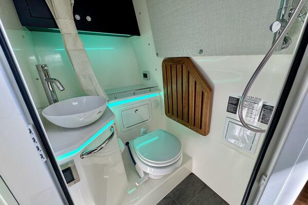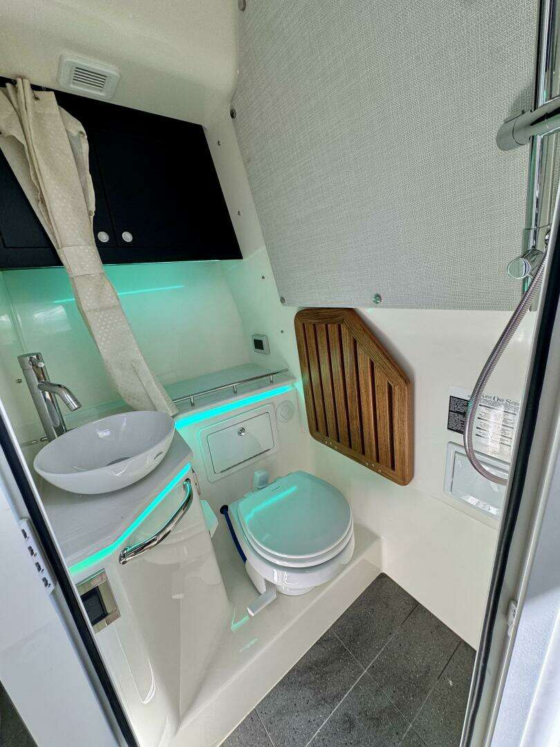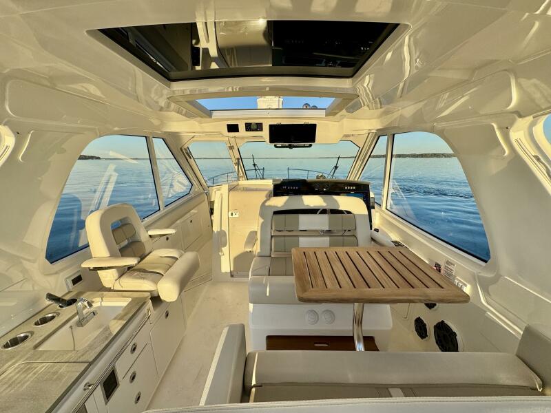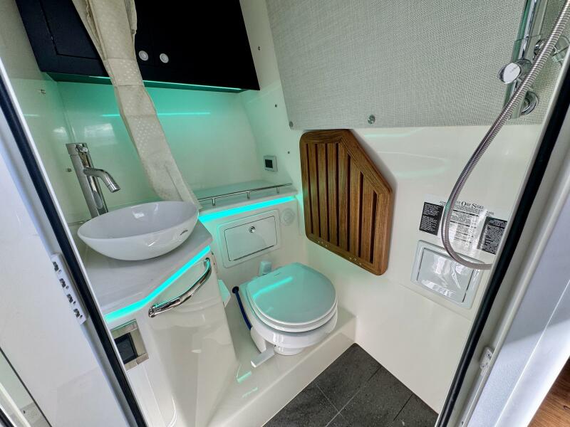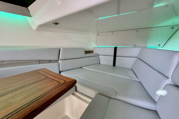 - Cabin features fully enclosed head with shower, galley, entertainment center and convertible V-berth for overnight stays