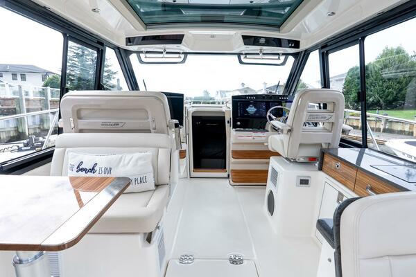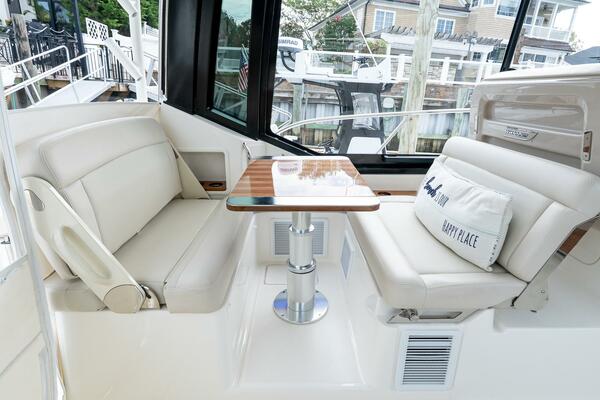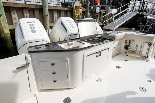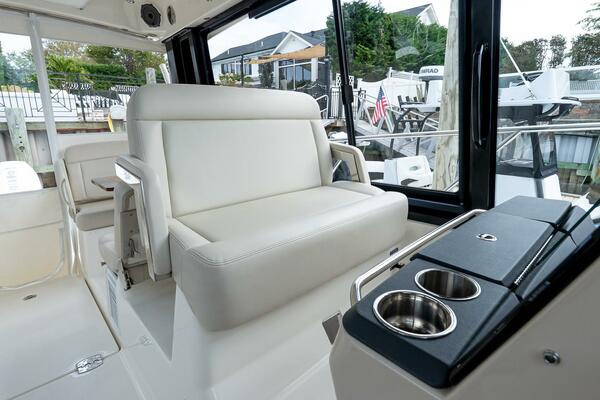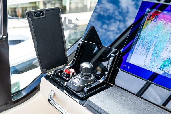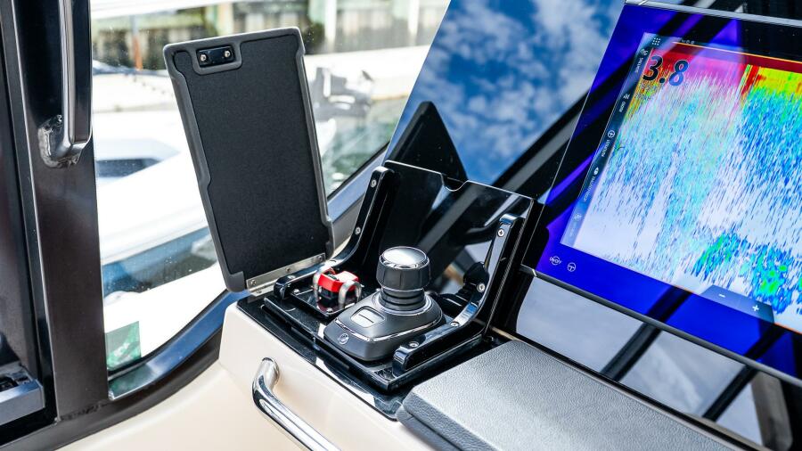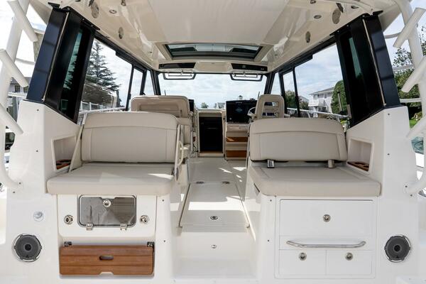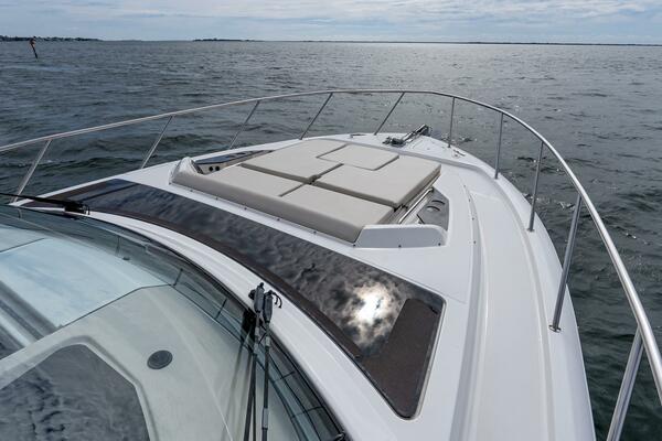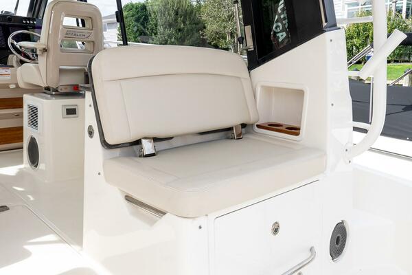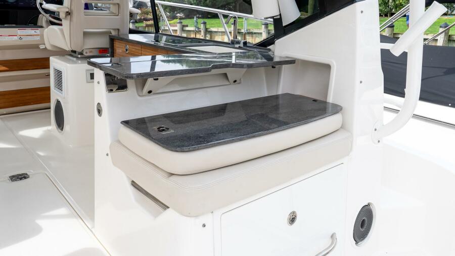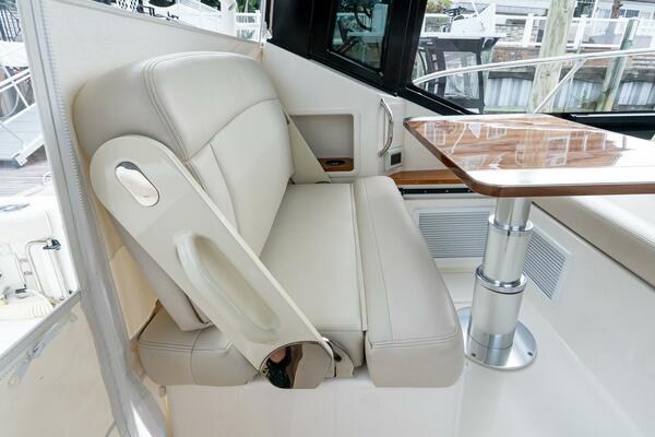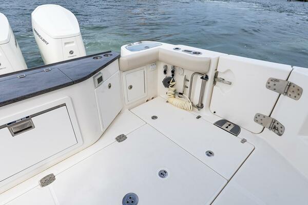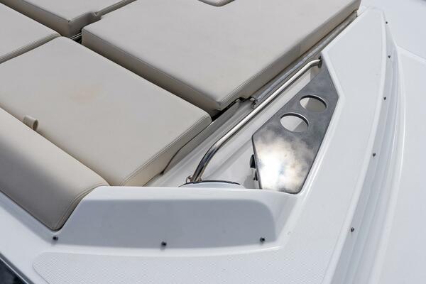 - Drink holders (stainless steel) (4 in bow, 2 in hawse pipes, 2 at helm, 2 at port console, 2 at port lounge, 2 per side in recessed pockets at aft helm deck seats)
