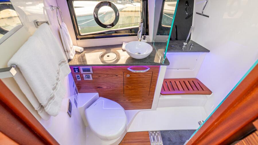 - Vacu-Flush® toilet (electric), holding tank with vent filter, overboard discharge, dockside pump-out, tank full indicator alert and progressive tank level indication integrated into digital network