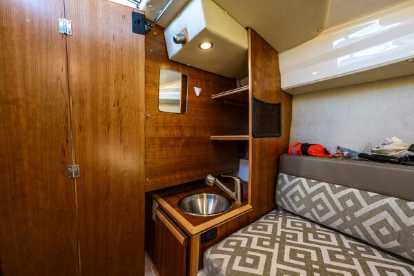 Below the dinette is a mid-berth, perfect for kids or providing additional storage.