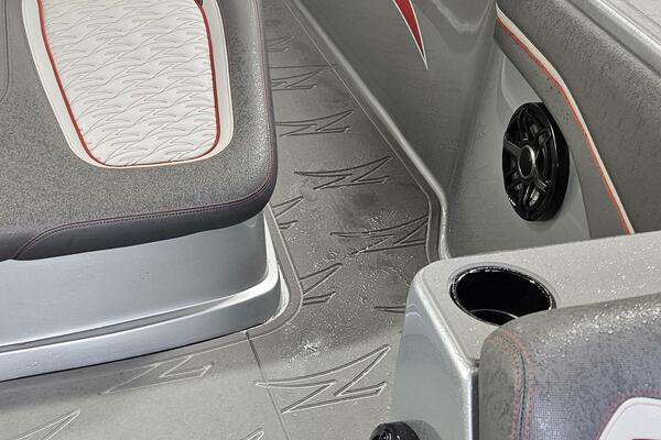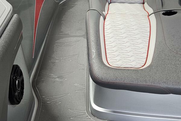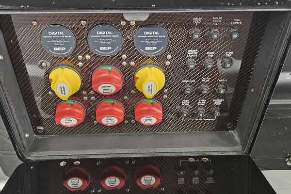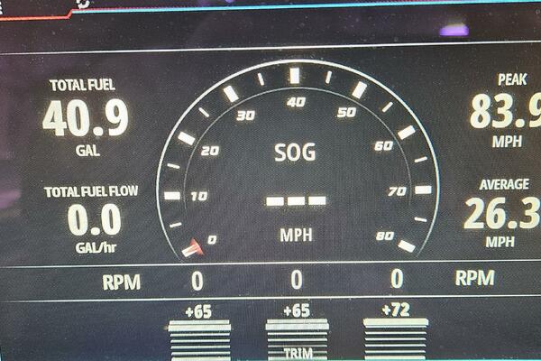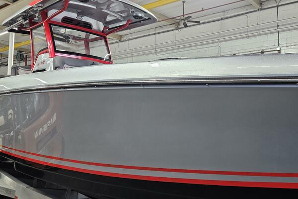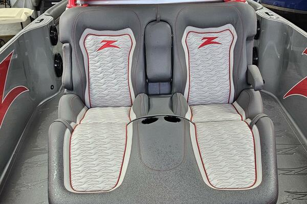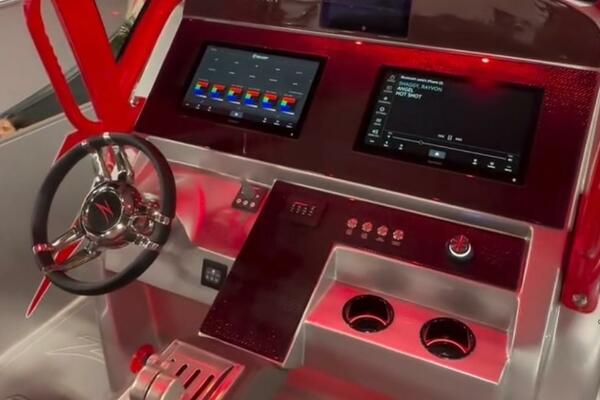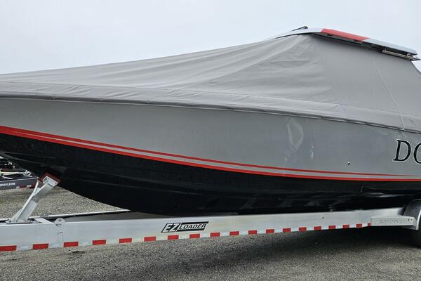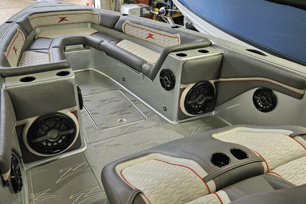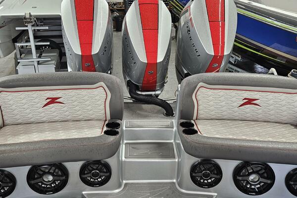 Cruises nicely in the 45-50 mph and will run north of 80 at WOT. This is a very cool piece and loaded with options such as custom paint inside and out, forward lounge seat with storage, 2nd row seating, center helm bolster w built in throttle/binnacle, rear electronic sureshade, custom made full cover ( as seen in the photos ) powdercoating option, led cupholders, folding footrest, upgraded JL audio pkg, underwater lighting, lithium battery pkg, transom shower, stainless windlass, STR jackplates, bow thruster and much much more !!