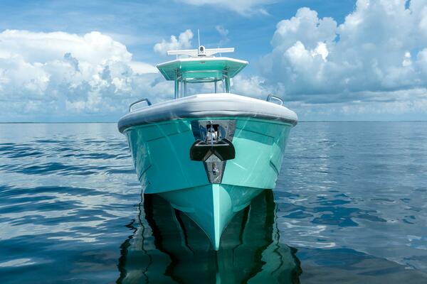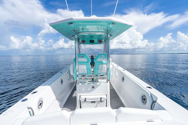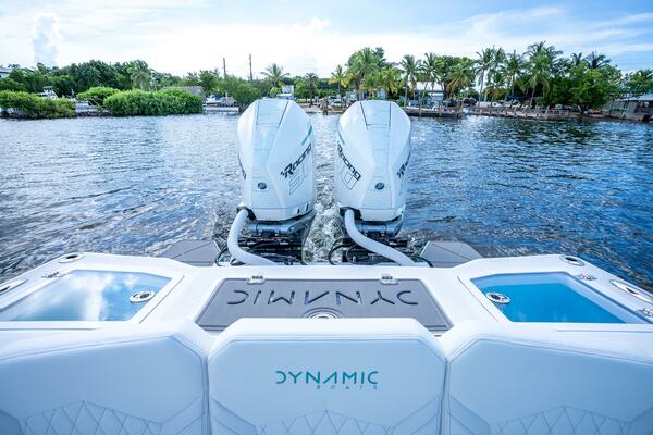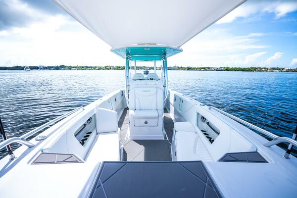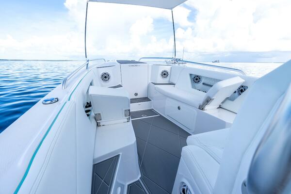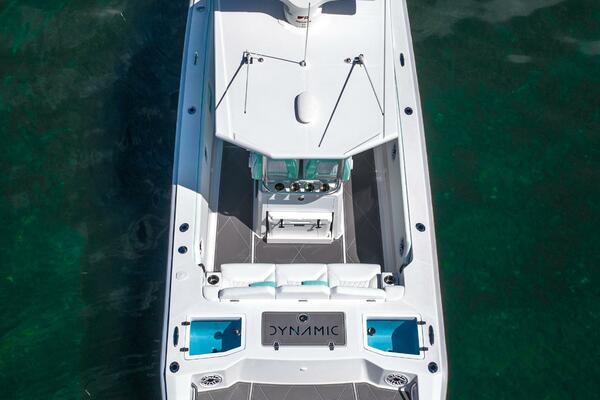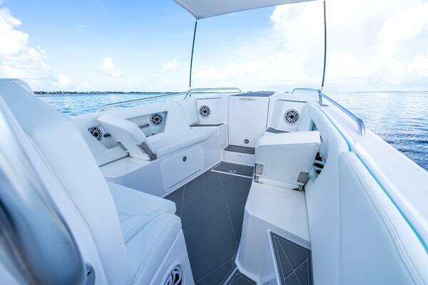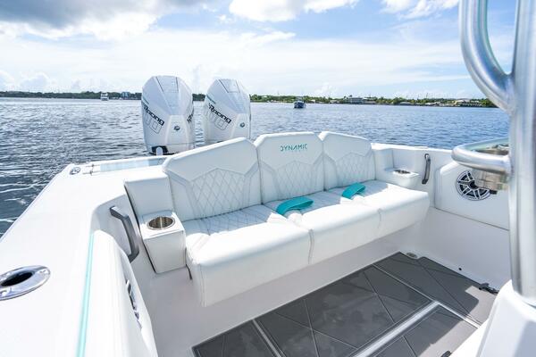 Dynamic offers a variety of seating options on the 305V. In the bow, a dual bench Fiberglass seats with a fully flush cabin hatch that turns into a sun-pad or a platform, it makes the ultimate utility for any day on the water. Equipped with full beam seating in the aft, leaning post Yeti 45 cooler, and SEAKEEPER RIDE system. You can fit the whole family and friends, or use the versatile layout and features day or night to fish, cruise around, island hop, commute and so much more!
