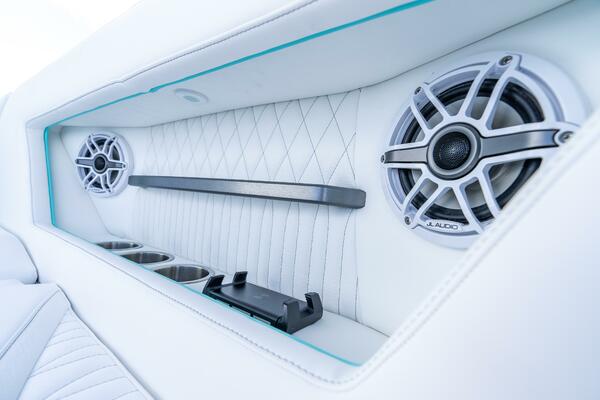 The 305V can be designed any way you choose. This boat makes a Dynamic statement with the upgraded premium upholstery, custom foam decking, a console with a full 22" screen w/ FLIR night vision camera. Interior cabin has an Electric toilet and fresh water sink with lighting. All of this accented by the amazing Lumitec lighting package all RGB controlled by the Poco system through the MFD.