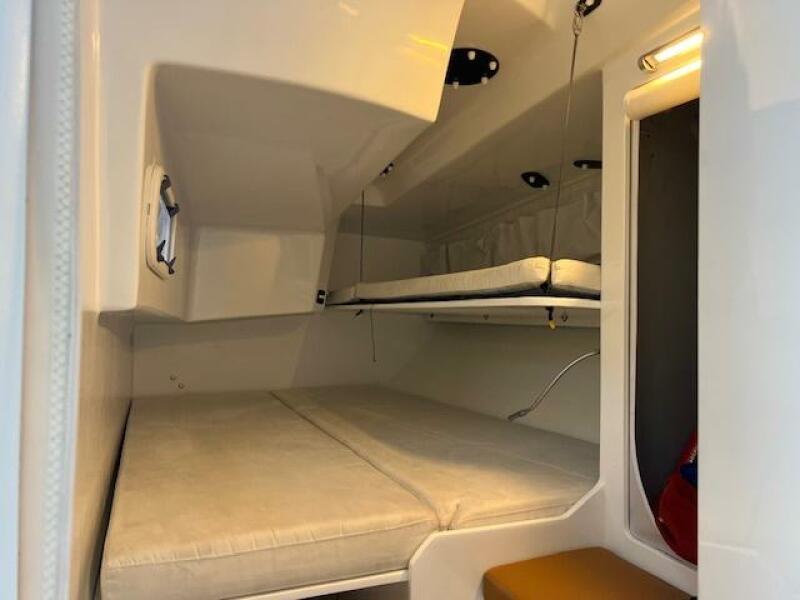 .Going down 5 Carbon steps the cabin is bright and airy thanks to numerous windows and opening hatches.All exposed moulded surfaces are painted in a white gloss finish.Cabin soles are composite construction and covered in a tanned sea deck material. Along the centre line is a white painted carbon table that can easily accommodate 6 for dinner.Port and starboard couch's on either side with abundance of storage under and behind each seating area.Under the starboard settee is the water maker and freshwater tank. Under the port settee is the water ballast pump mechanics for the lifting keel,
