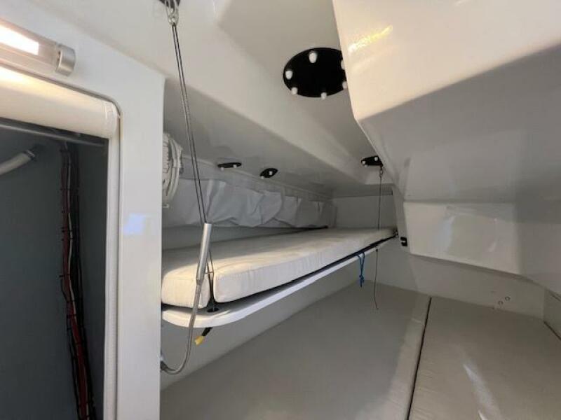 Galley is situated forward of the mast on the port side is a fridge and carbon sink with fresh water.Directly across to Starboard are 4 storage compartments and a induction stove top and oven.