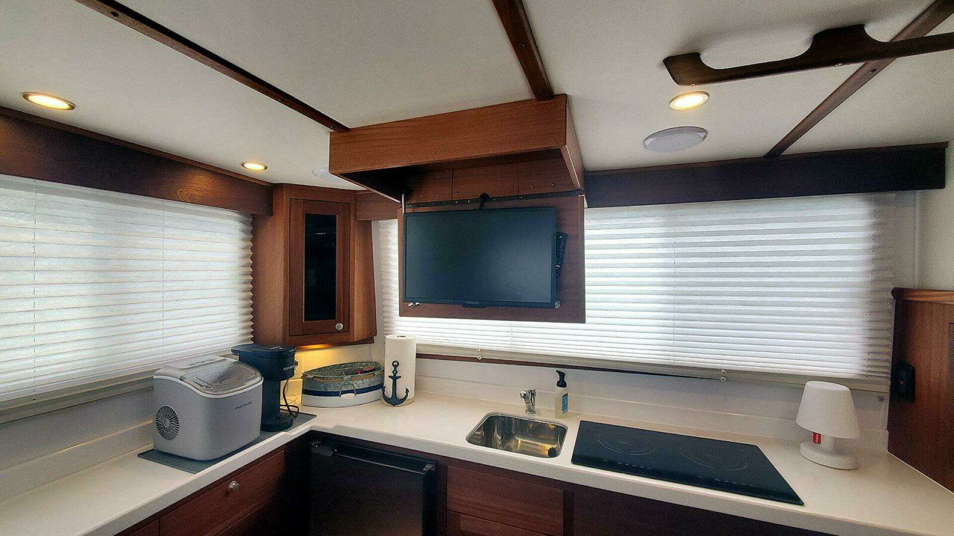 Large windows and a glass-framed aft door fill the cabin with natural light, giving it an open, airy feel. To starboard, a built-in L-shaped settee converts to a double berth and is paired with a hi/lo dining table for flexibility. Overhead, an Insignia 24" flat-screen TV folds down above the galley for convenient viewing. The space is finished with a sapele and holly sole and cellular blinds on all windows, blending classic Nordic Tug craftsmanship with modern comfort.