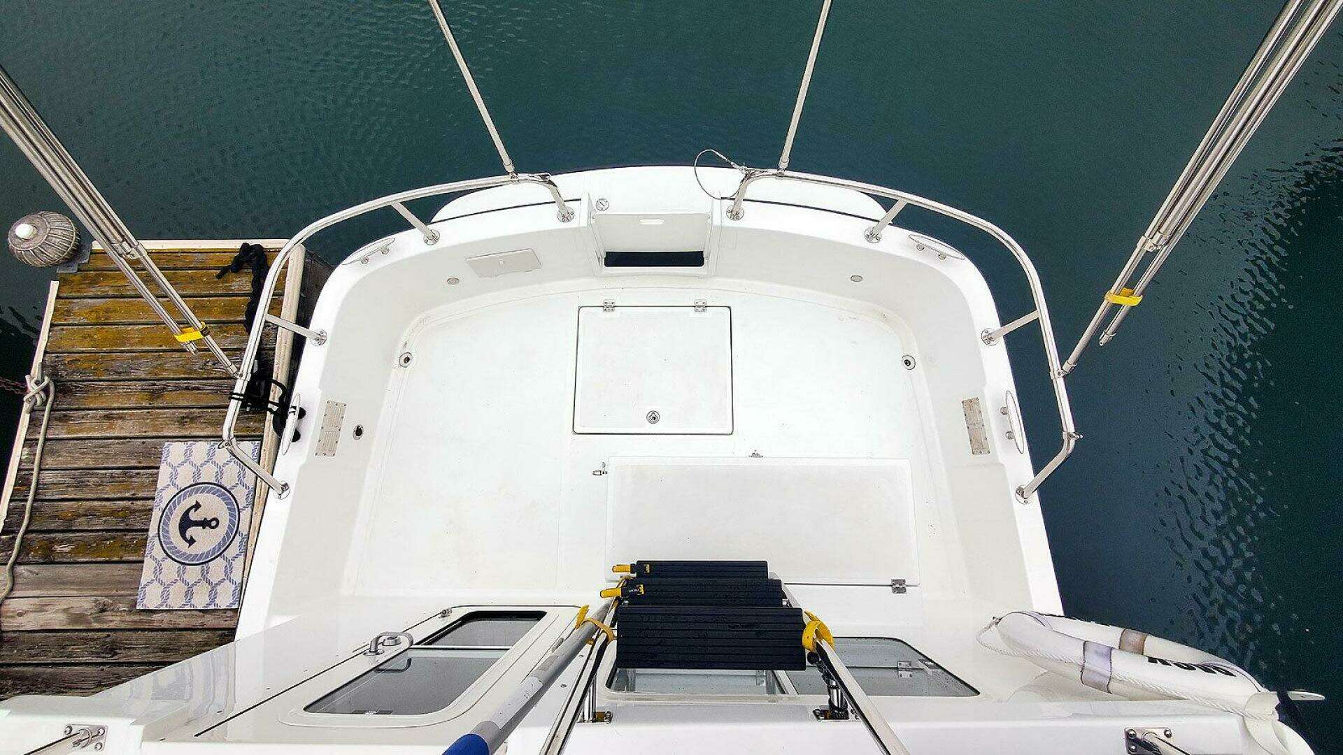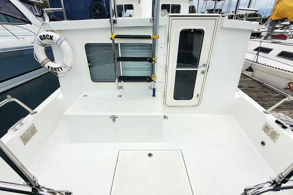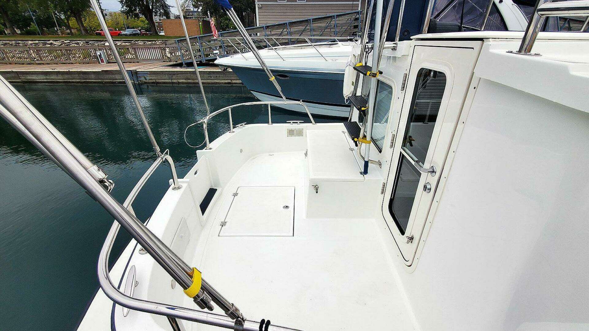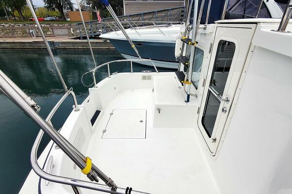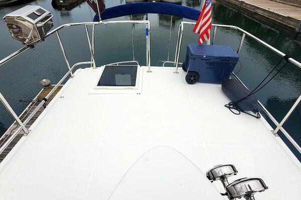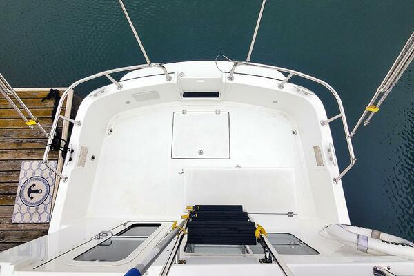The cockpit is designed for both functionality and relaxation, featuring non-skid decking and easy access to the integrated swim platform through a transom door. Quality craftsmanship is evident in the stainless-steel rails and hardware, ladder with synthetic treads leading to the upper deck, and a storage box/bench seat that adds both utility and seating. Additional features include a hot and cold freshwater shower, lazarette access, and an aluminum and glass entry door to the main cabin. The upper deck offers a large open space ideal for additional seating, sunbathing, or tender storage. From here, you have access to the pilothouse roof and mast along with a Magna Grill making it the perfect spot for casual dining or enjoying the view at anchor.