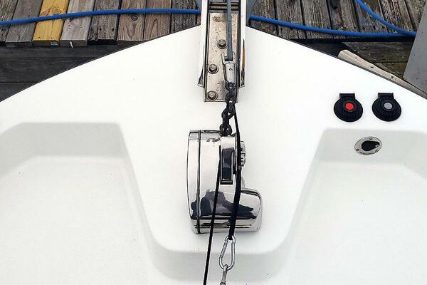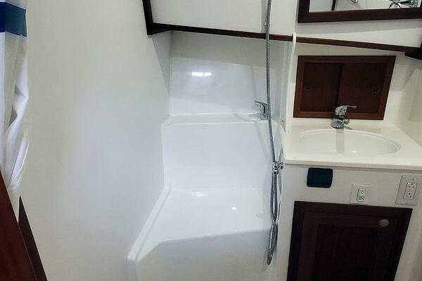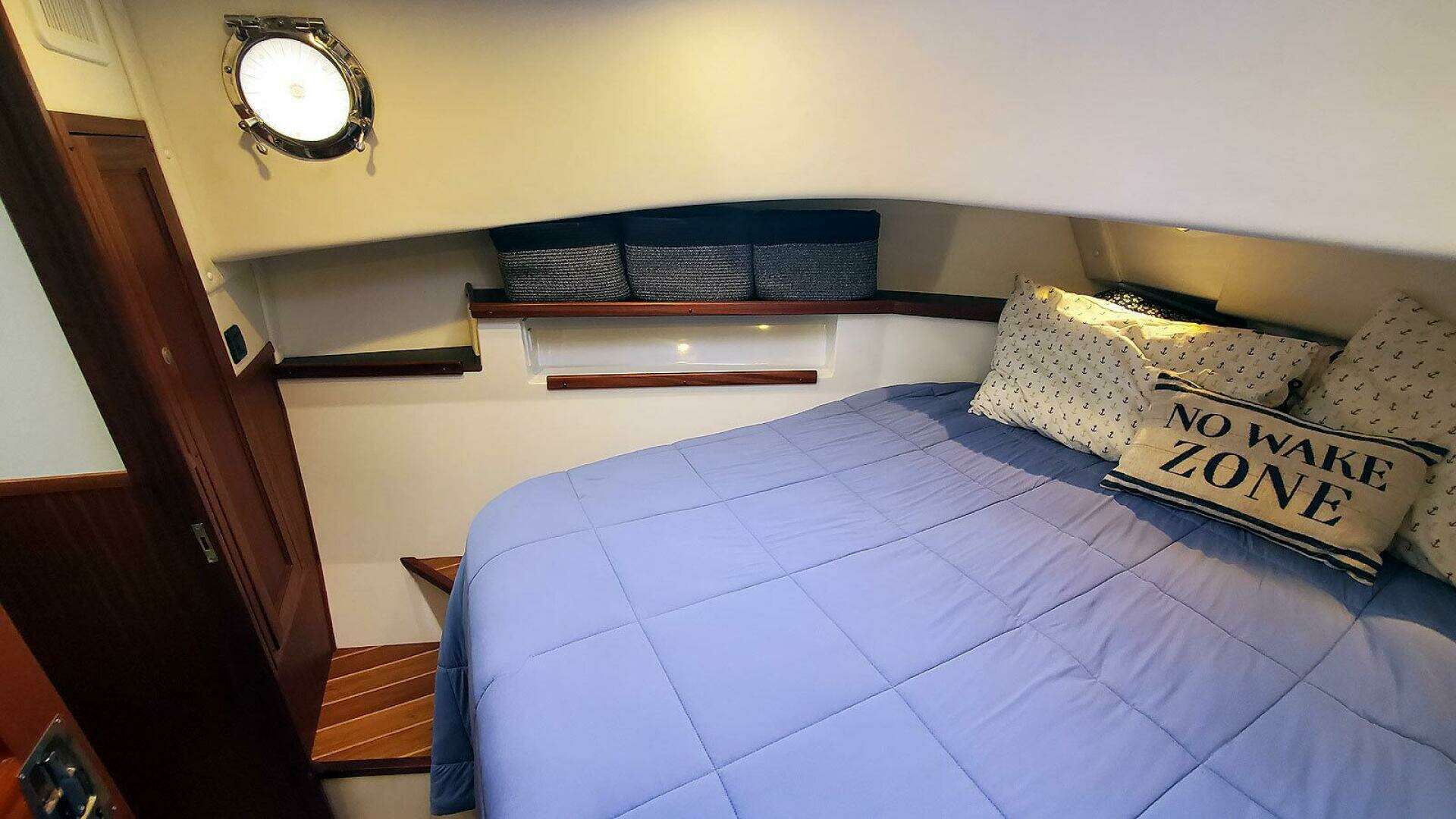 Back Forty features a bright and inviting master stateroom forward, highlighted by a centerline queen berth surrounded by ample storage and warm natural light - a comfortable retreat after a day on the water. The L-shaped settee in the main cabin also slides out to form a double berth, providing comfortable guest accommodations without sacrificing living space.