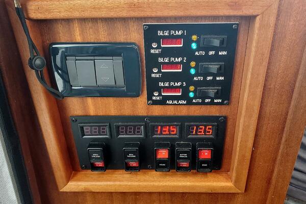 The raised pilothouse offers excellent visibility and easy access throughout the boat, making it an ideal command center for extended cruising. To starboard, the full helm station is thoughtfully laid out, with additional electronics and controls overhead for convenience.