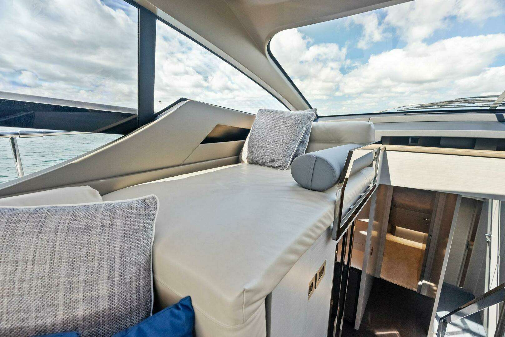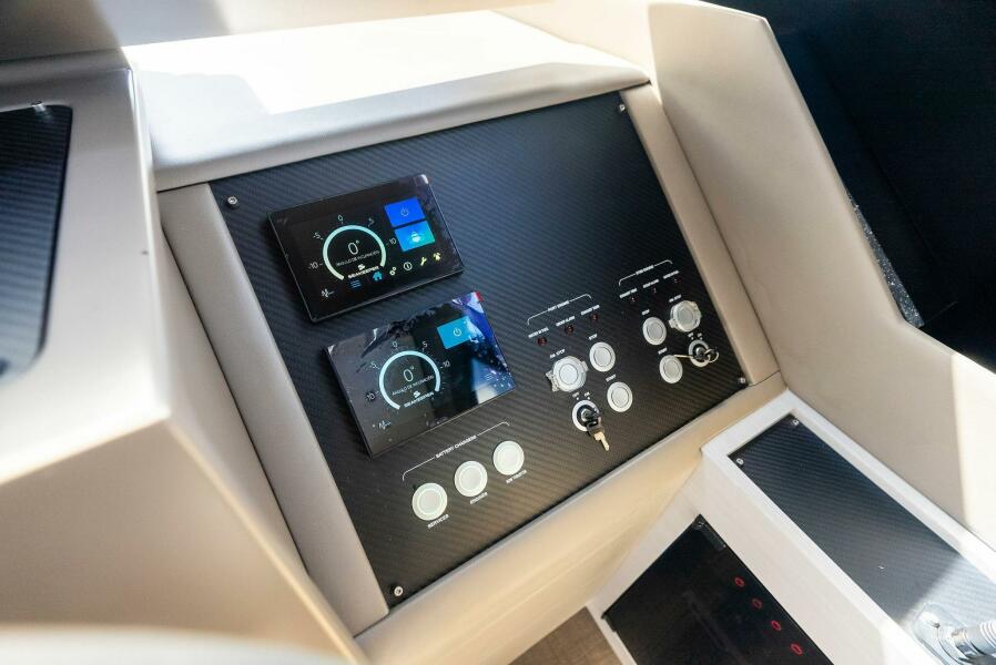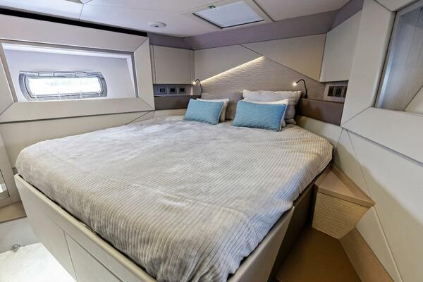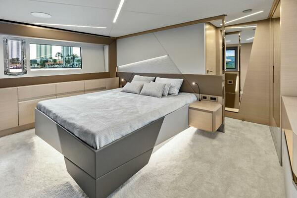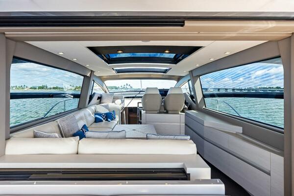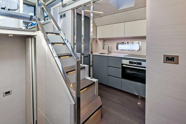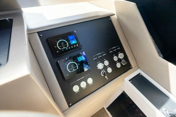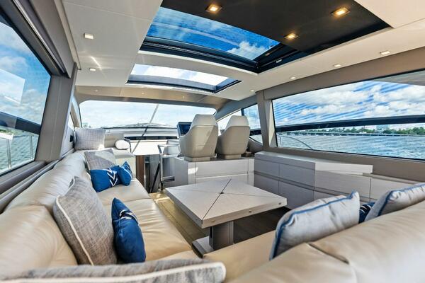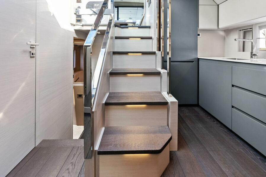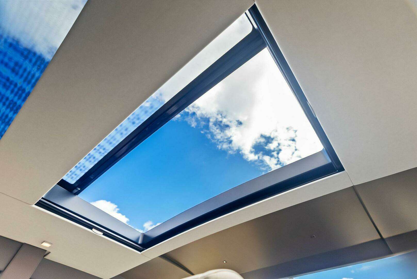 The spatial ergonomics is maximal thanks to volumes that blend technology and performance in perfect proportions. The open spaces allow the boat to be filled with pleasure and light, such as the large lounge characterized by the front openable windows and the dark glass sliding roof. The new, much larger rectangular portholes allow air and natural light to permeate the rooms below decks.