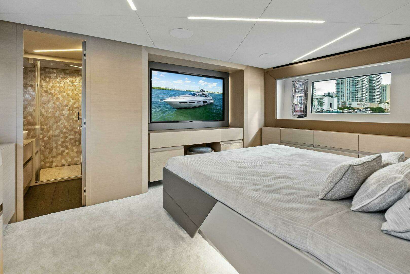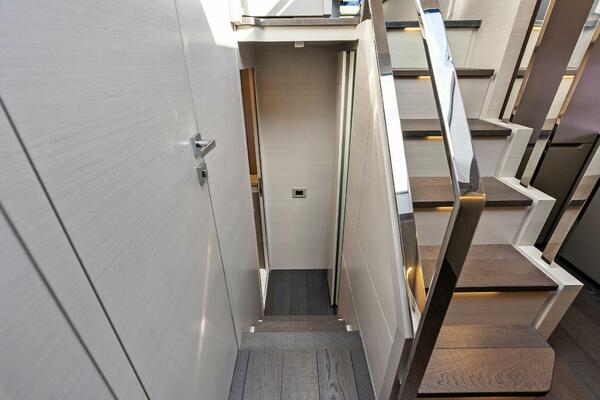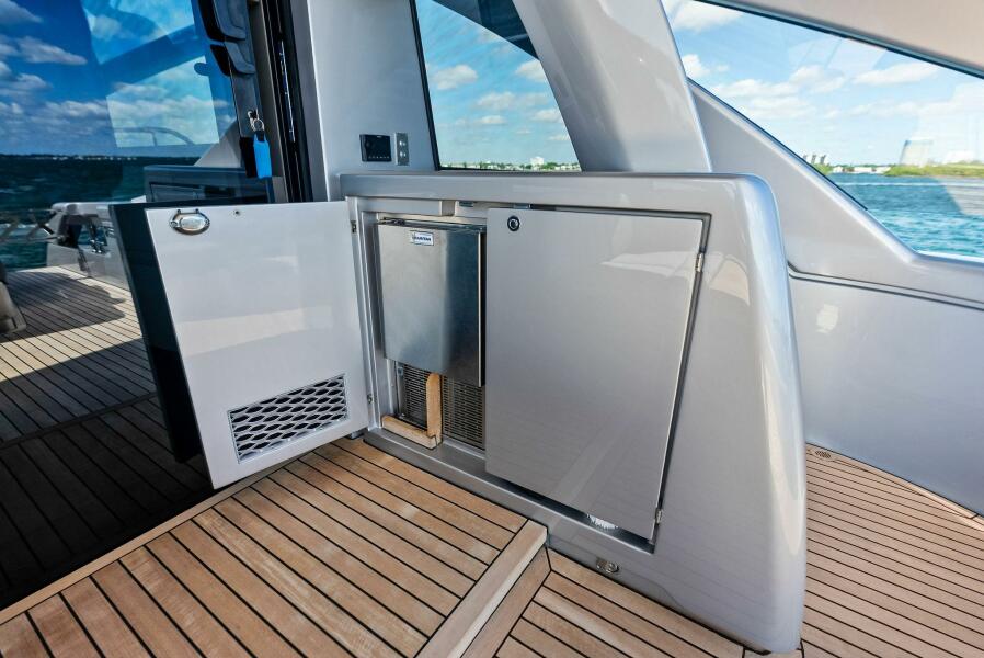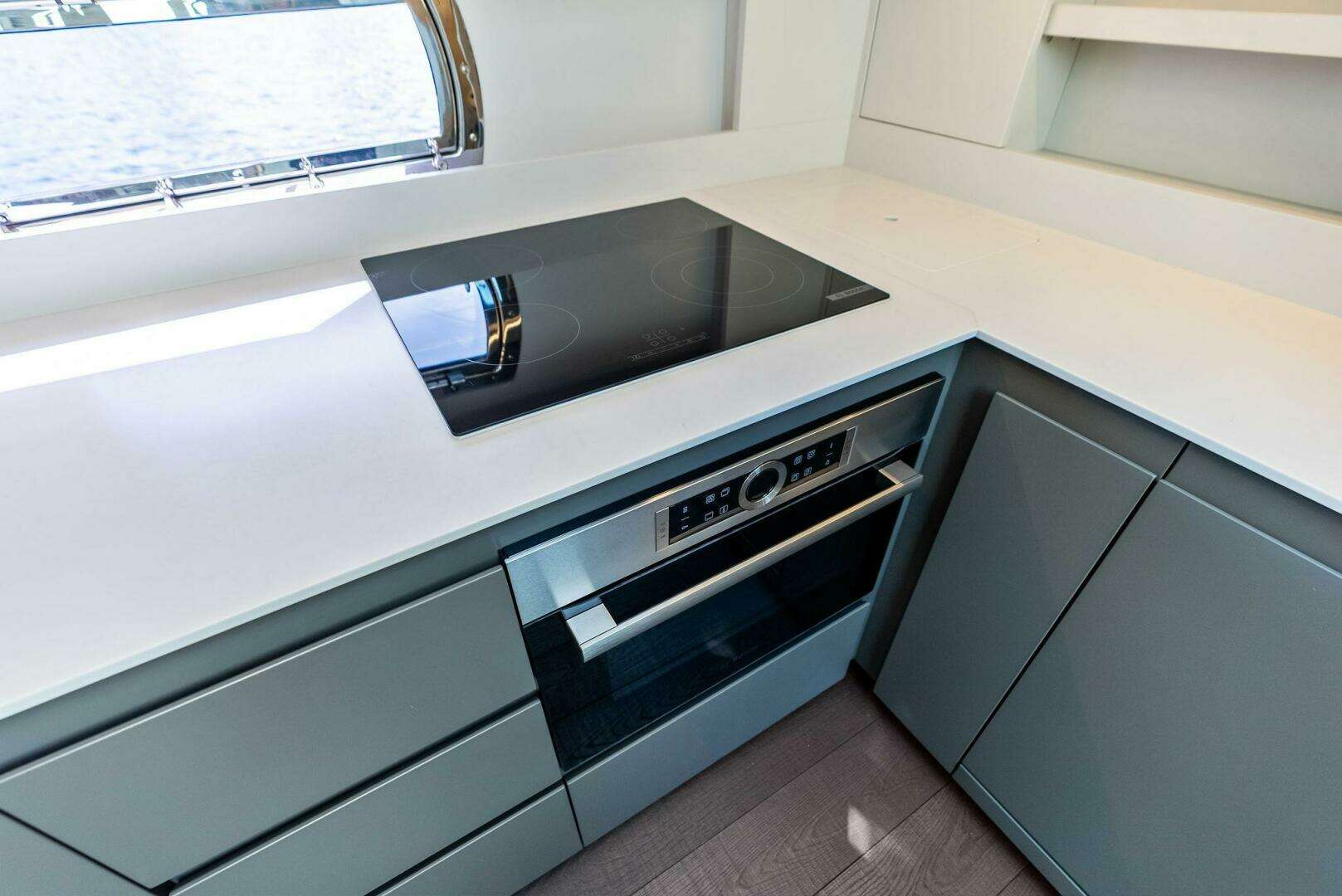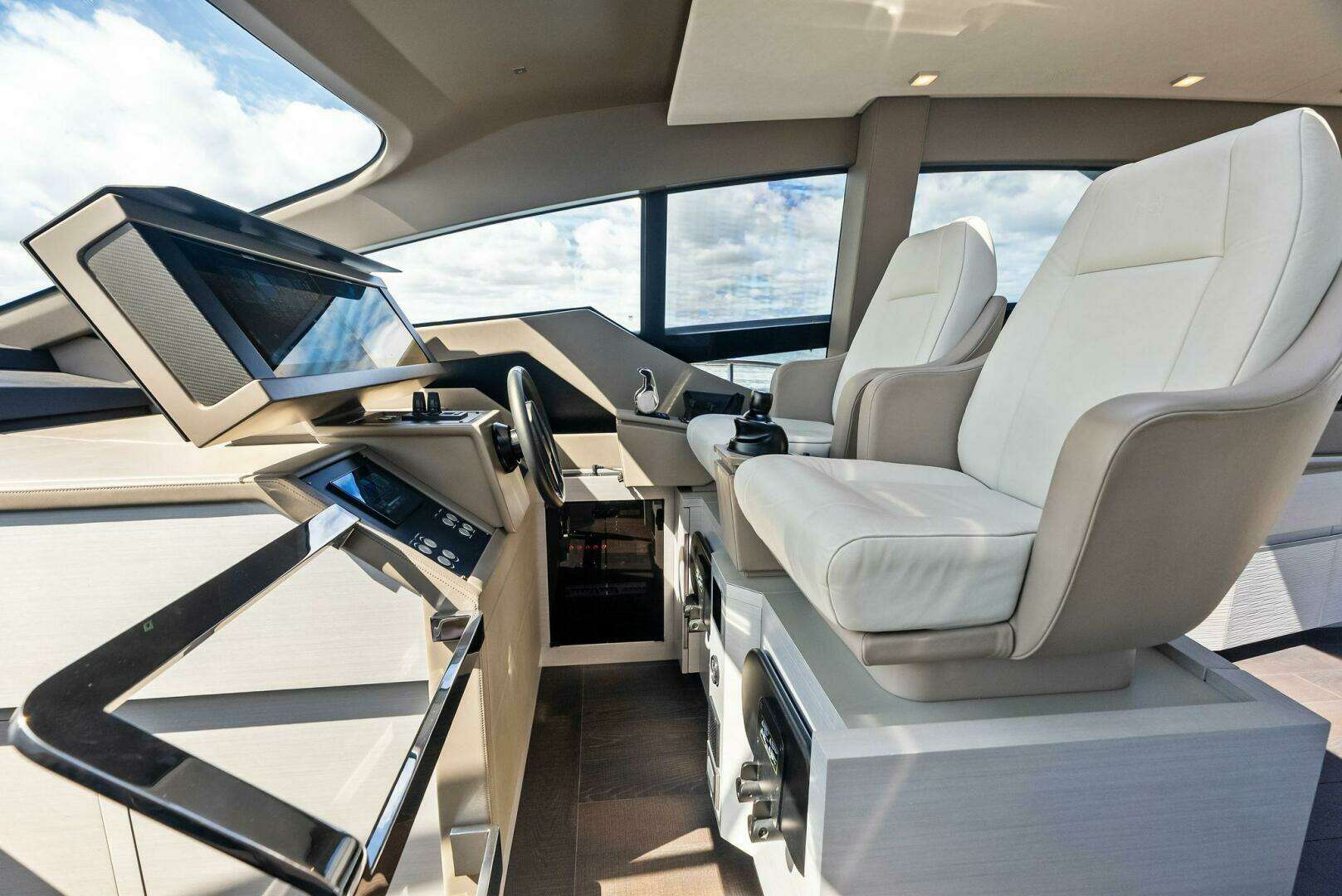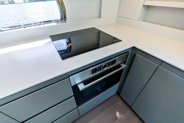The spatial ergonomics is maximal thanks to volumes that blend technology and performance in perfect proportions. The open spaces allow the boat to be filled with pleasure and light, such as the large lounge characterized by the front openable windows and the dark glass sliding roof. The new, much larger rectangular portholes allow air and natural light to permeate the rooms below decks.