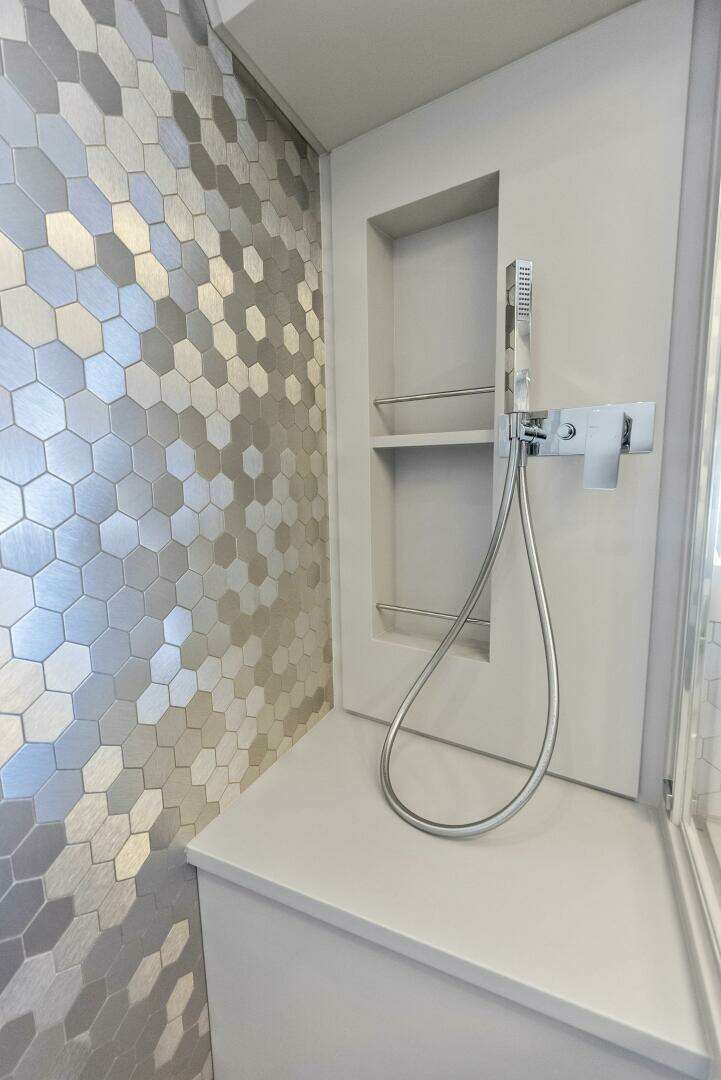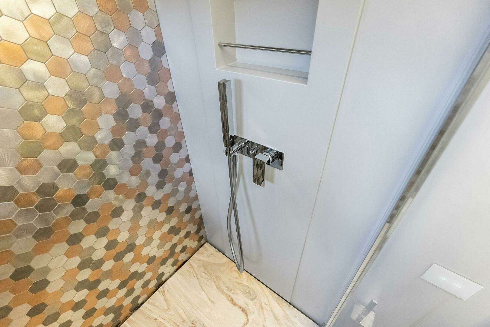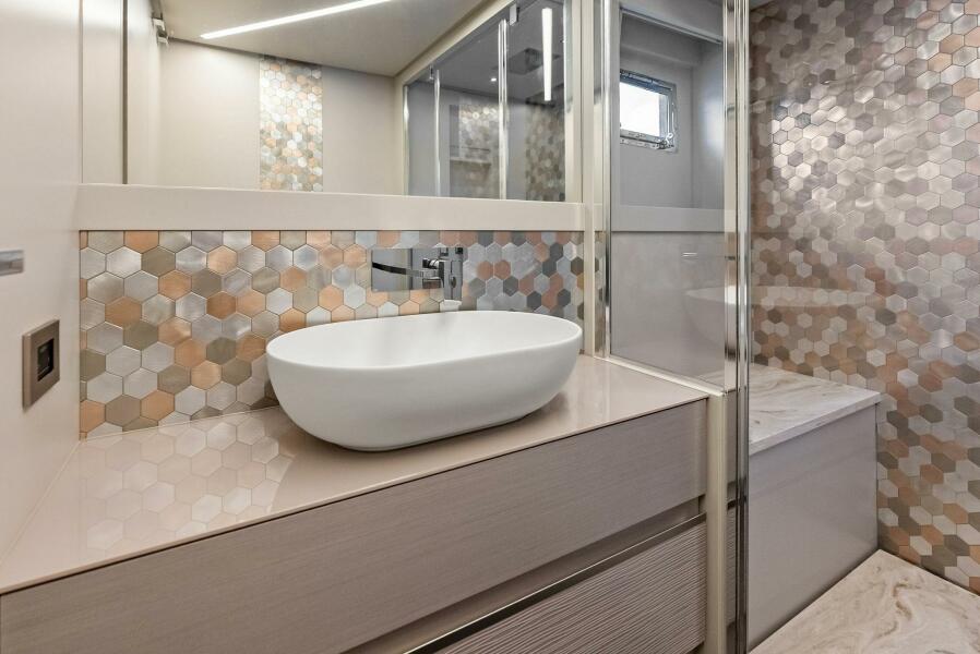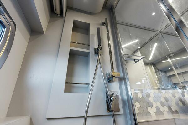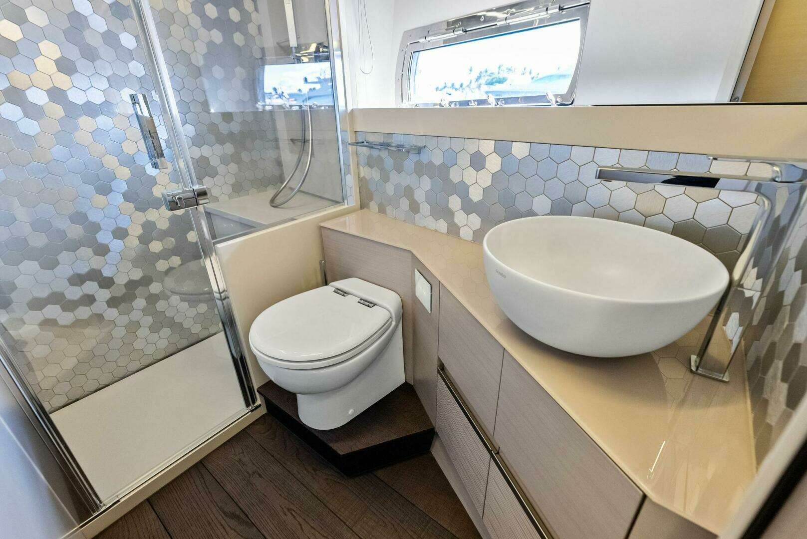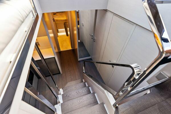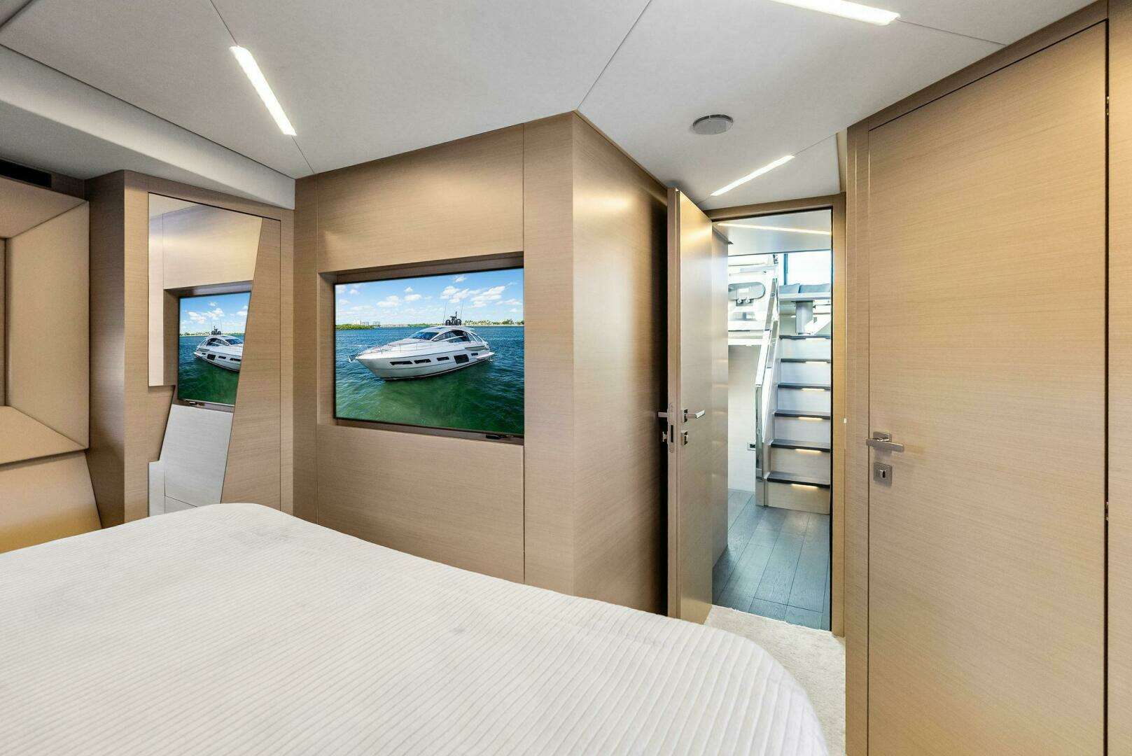 The spatial ergonomics is maximal thanks to volumes that blend technology and performance in perfect proportions. The open spaces allow the boat to be filled with pleasure and light, such as the large lounge characterized by the front openable windows and the dark glass sliding roof. The new, much larger rectangular portholes allow air and natural light to permeate the rooms below decks.