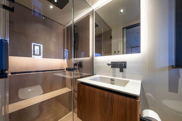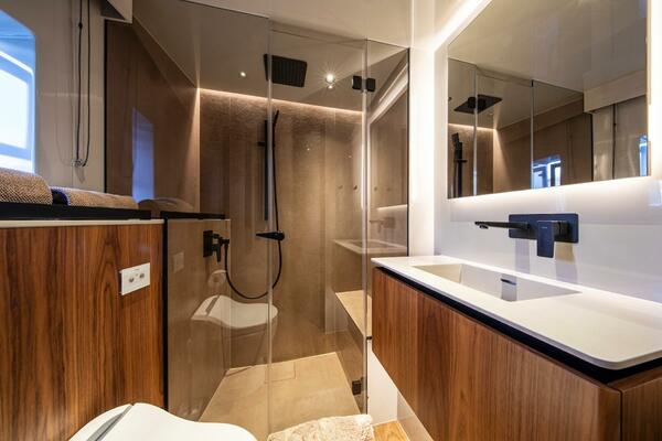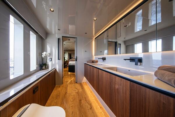 Opposite to starboard a private staircase leads down to the master suite and I love how the master is isolated for privacy purpose. One of the main reasons the master cabin stands apart from the other suites is due to the size of the bathroom which has both his and hers sinks and spacious walk-in shower. The cabin itself has additional storage, vanity and a larger floor plan. She's also located exactly midship which is the most comfortable location on the vessel when underway.
