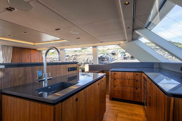 Entering the main salon through large sliding doors you have a dining table located to starboard and to port a large settee. When the sliding doors are all the way open (with the flush deck) the interior and exterior spaces combine into one and this is where you can really appreciate that 37' (11.5m) beam. All the way forward in the salon you have the main helm station and wet bar area complete with sink- with water purification faucet (hot, cold, sparkling)- refrigerator, ice machine, wine fridge, dishwasher and one of my favorite features which is a watertight door that leads to the bow terrace area. Due to the large windows your line of sight can continue all the way from the bow of the boat to the aft deck assuring all guests remain connected. The flow between the different designated areas works extremely well.