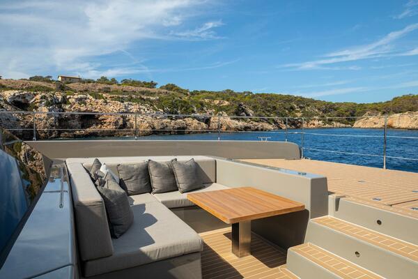 Heading up on those aft deck stairs you reach the sundeck. An expansive hard top provides ample shade for the smaller second help, as well as another dining area with substantial teak table, chairs and built in bench seating. Centerline back aft is a glass jacuzzi surrounded by sunpads as well as some built in storage, a refrigerator, ice machine and sink. This level also holds a deck freezer (12.5 cubit feet) to port and a matching dock box which holds 180 liters of petrol in 20 liter stainless steel jerry cans.