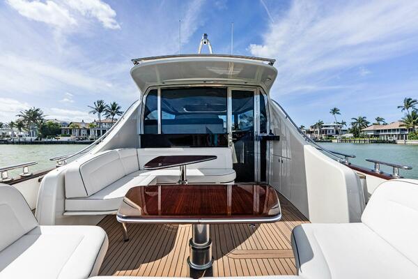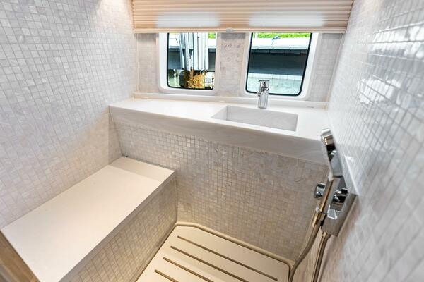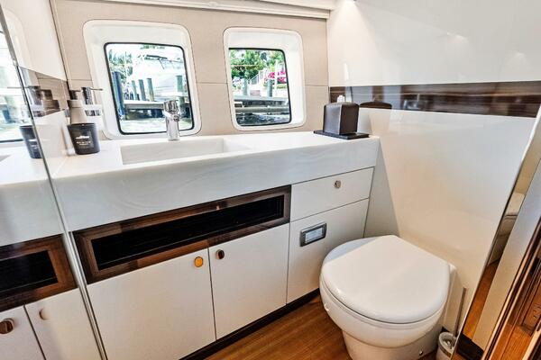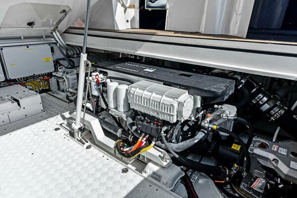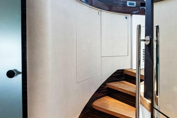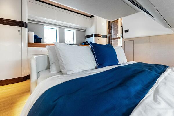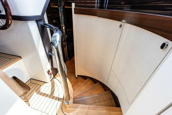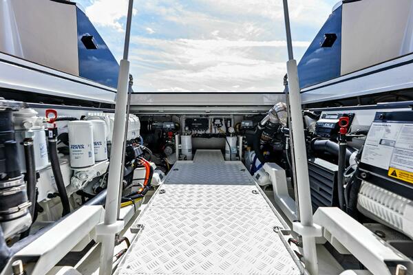 Cockpit and Deck: Designed for entertainment, the cockpit offers a full walkaround layout with side boarding doors on both port and starboard sides. A spacious swim platform with sun lounges and a hydraulic swim ladder enhances onboard leisure.