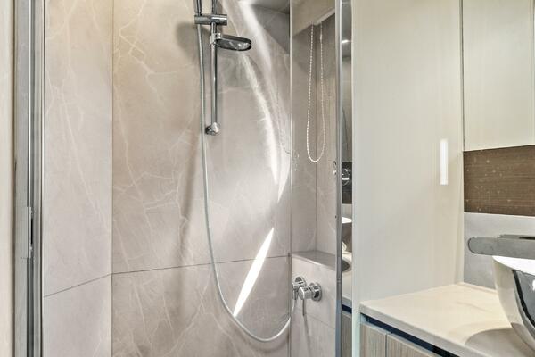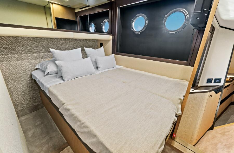 The VIP guest cabin midships could in every way be considered a second master, in terms of space, headroom, en-suite bathroom and finish. The third guest cabin has an electricalsystem, fitted as standard, for seamless transformation from twin berths to double. In addition, there is a versatile crew cabin, with practical access from the stern platform.