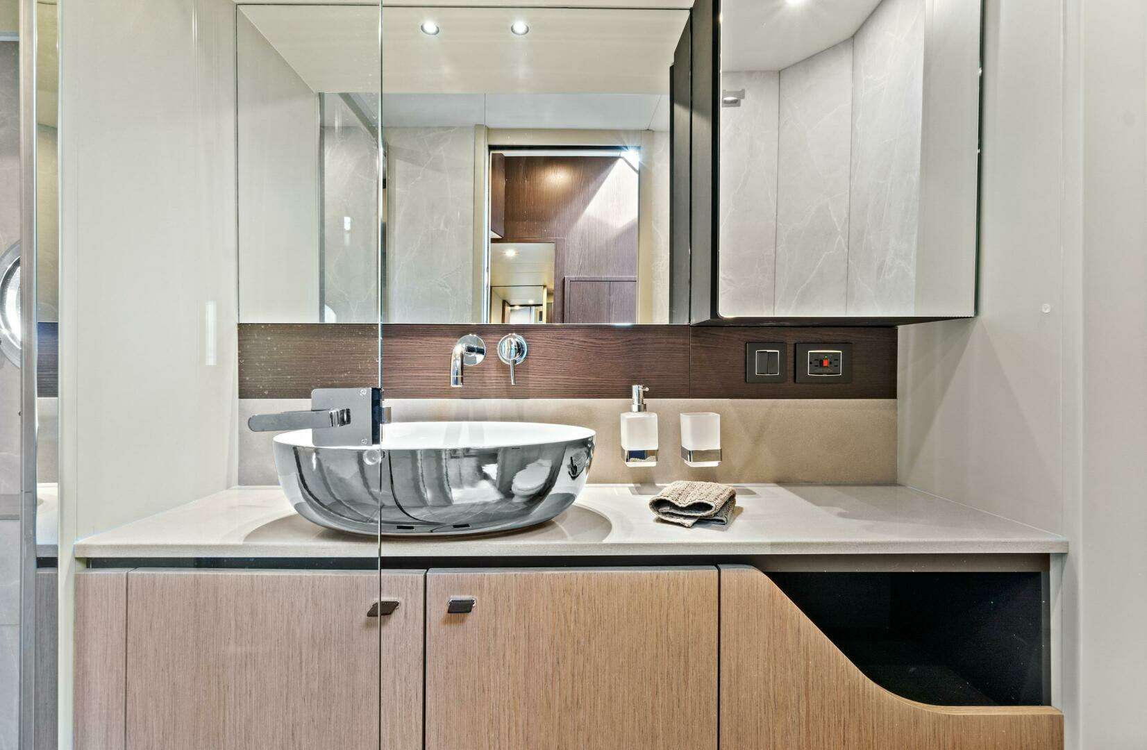 The bow location of the master cabin ensures peace, silence and privacy. Its full-beam layout optimises space, with a large double berth accessible from all three sides, extensive cupboards and storage units, and a superb marble bathroom.