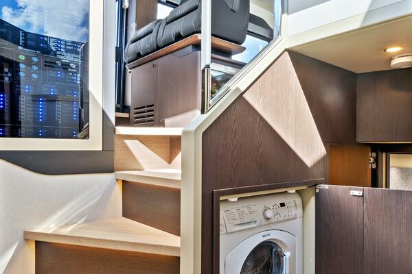 The use of extensive glazing, a familiar Absolute trademark, is particularly visible in the saloon, from where there are fantastic 360-degree views. In addition to air conditioning, natural ventilation can be provided by the electrically-controlled vertically sliding windows. The galley is fully equipped, and, unusually for boats of this size, there is also a spacious pantry.