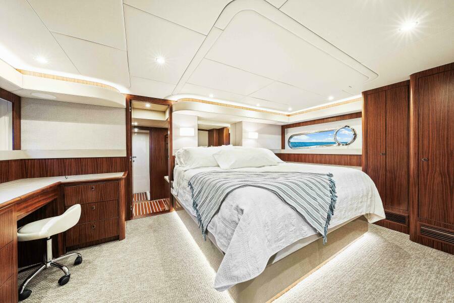 - Two (2) large oval port lights with integrated circular opening ports with alarms and fly screens. One port and one starboard master cabin