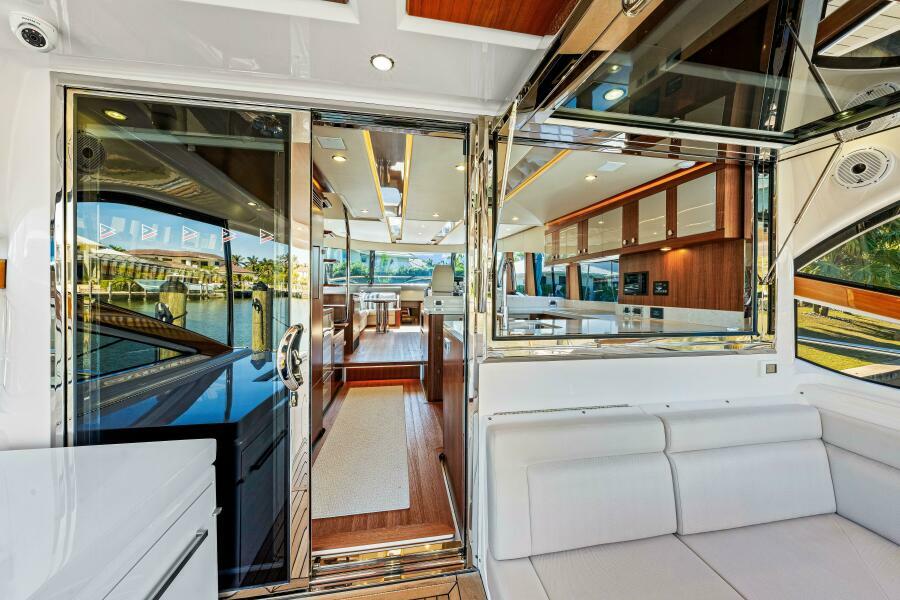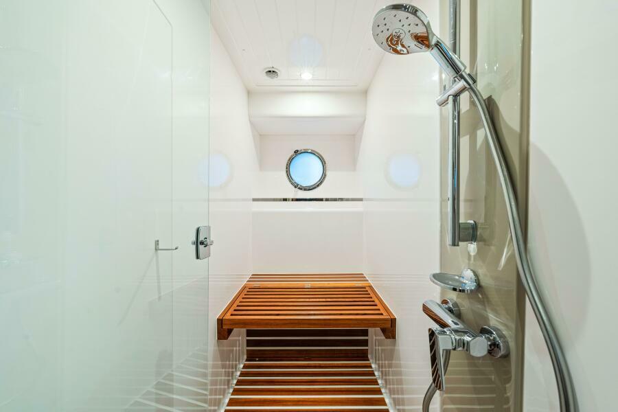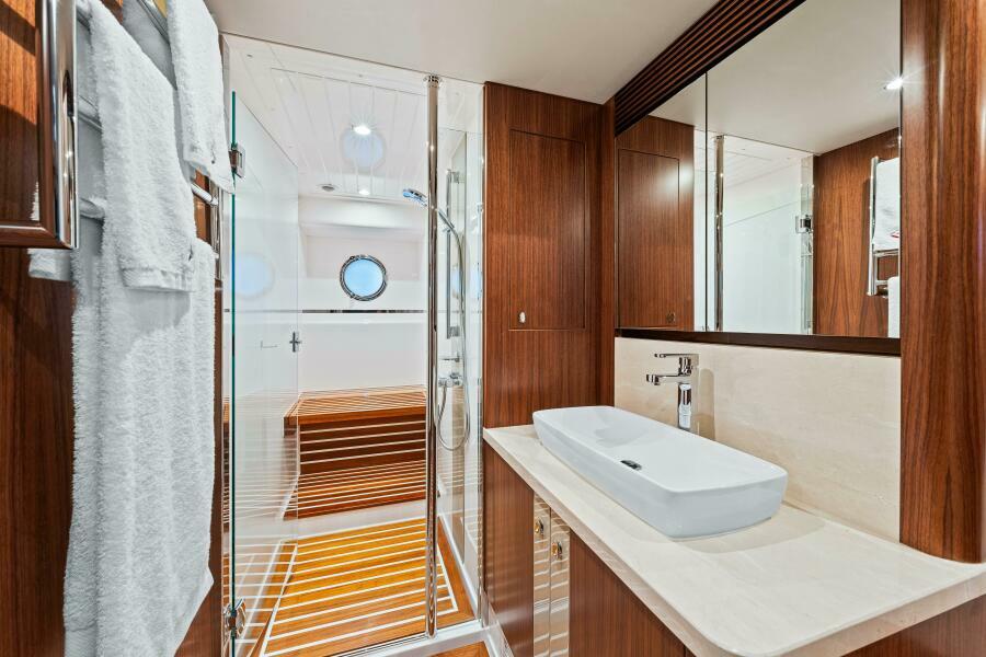 Enter via transom gates into a large, teak-laid cockpit with tender garage beneath, or through the side bulwark doors. Personalize the entire massive saloon area with select fabrics and bespoke finishes. The U-shaped galley, forward dining area and free-standing lounge will all delight. Outside, wide high side decks lead to the sun lovers’ foredeck.