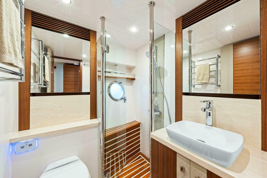 Descend the forward staircase to the accommodation deck. Choose from three or four-stateroom designs with three luxury bathrooms. Option of additional crew quarters or utility room.