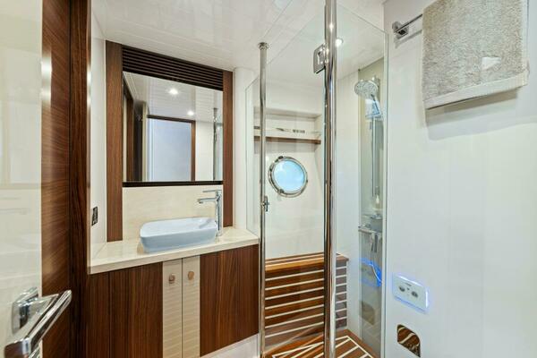 - One (1) medium sized oval port light with integrated circular opening port with alarm and fly screen to starboard forward Master bathroom.
