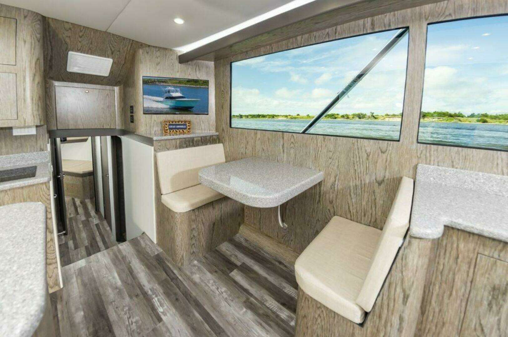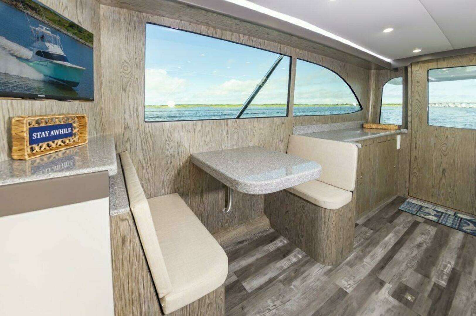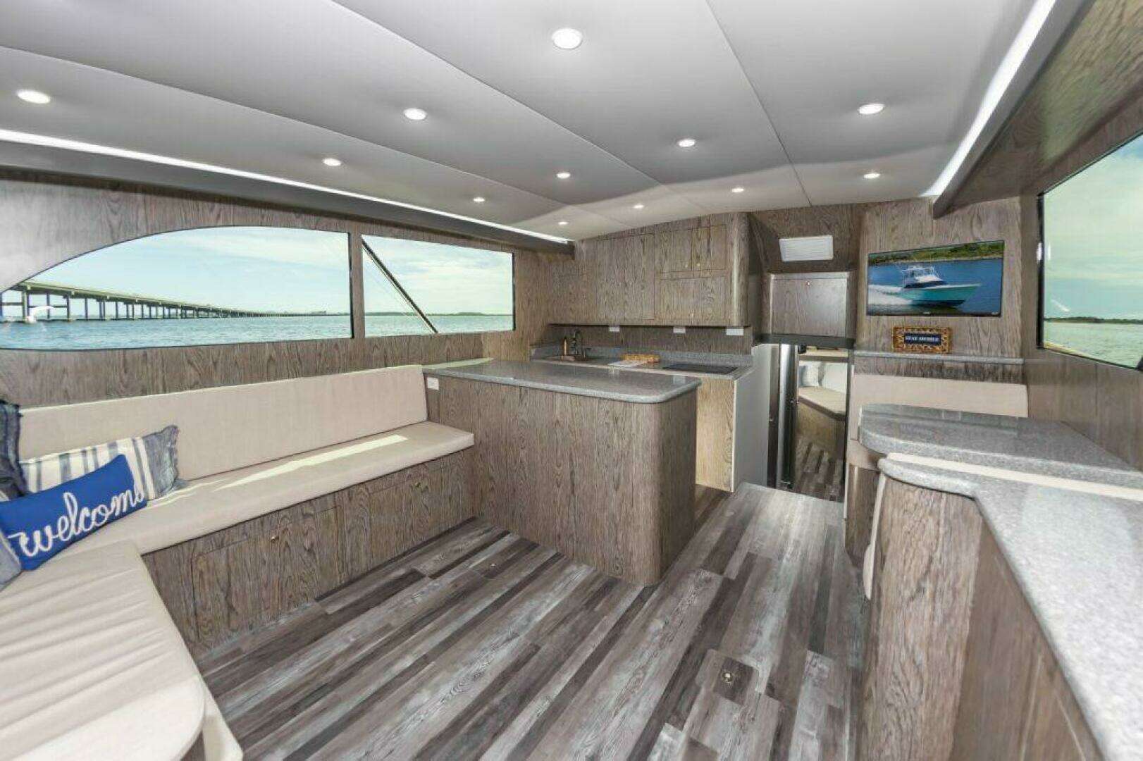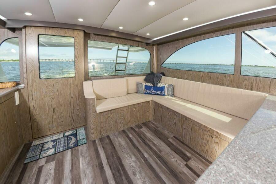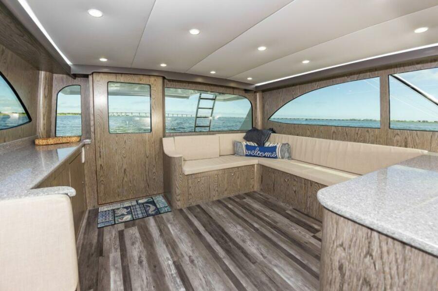 The salon and galley up with all the appliances and needs including storage under sofa, 2 person dinette, and full galley with Corian counters.Below are 2 staterooms, 2 heads, and a companionway tackle room.