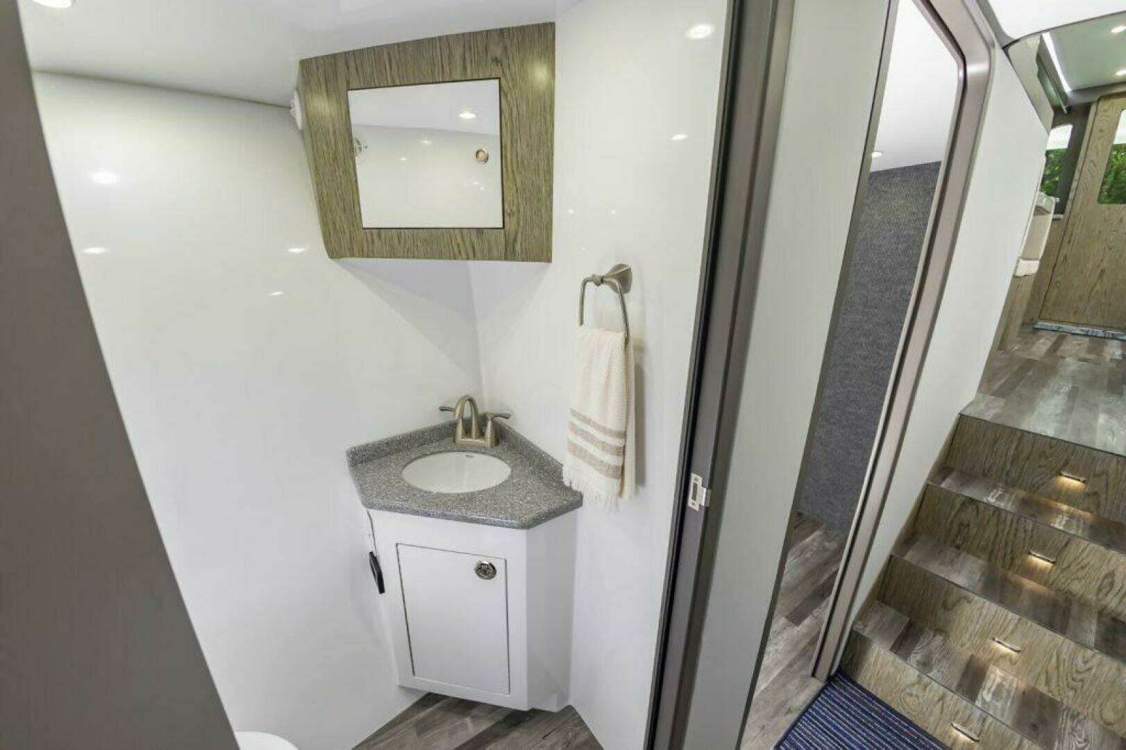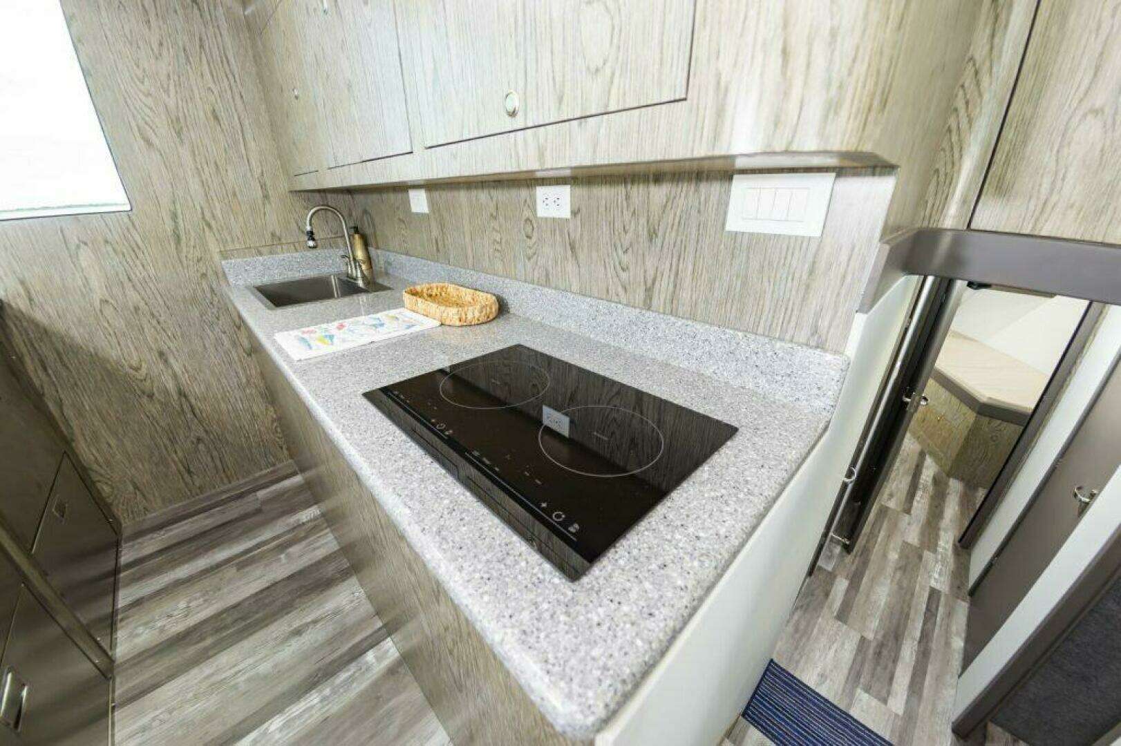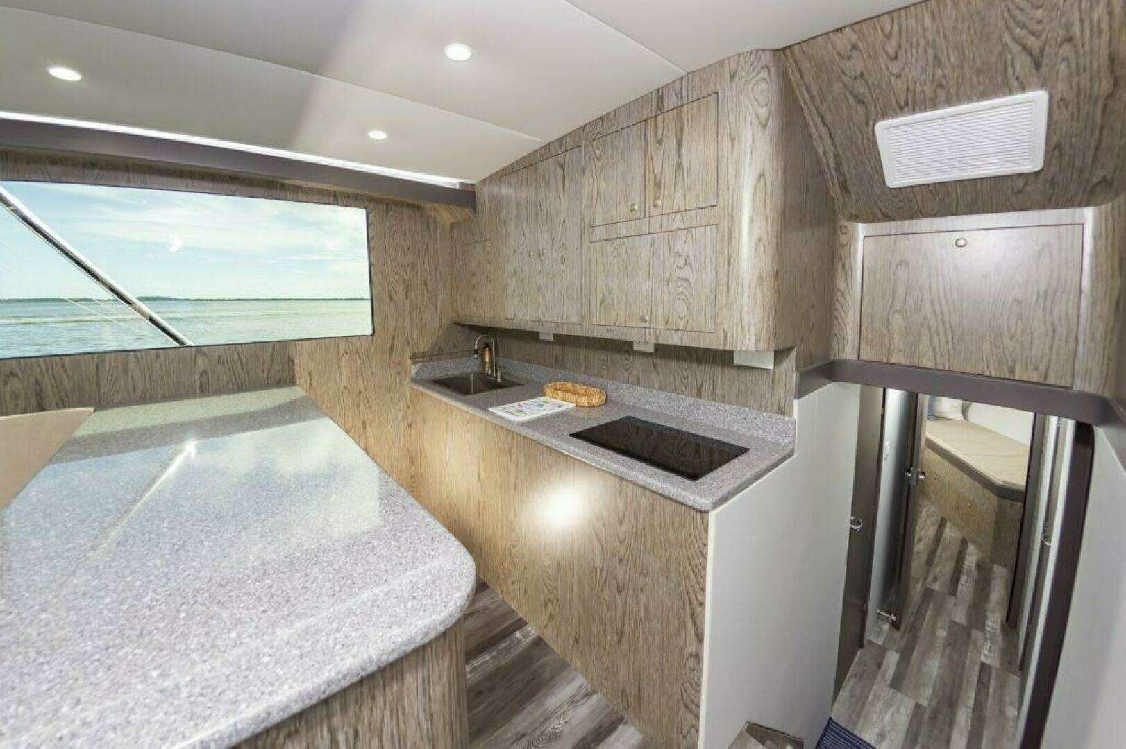 The salon and galley up with all the appliances and needs including storage under sofa, 2 person dinette, and full galley with Corian counters.Below are 2 staterooms, 2 heads, and a companionway tackle room.