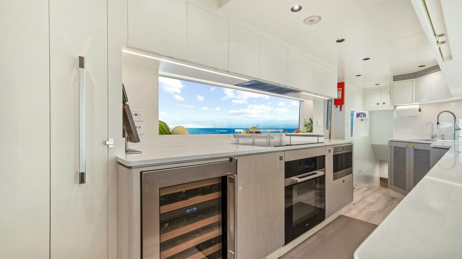 A mounted 85” Frame TV between the dining area and the galley offers dynamic artistic display. The galley itself, finished in bright Cambria stone and optimized for storage and function, invites culinary creativity and is tailored to the owner's preferences.