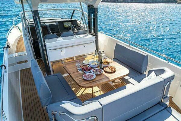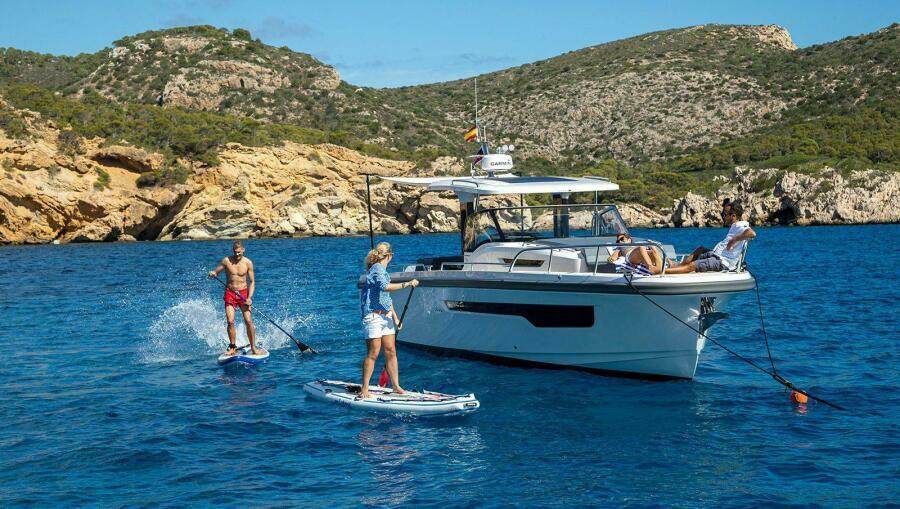 The lounge area has a large table and three sofas which, depending on their position, can function as a large sun pad or a seating area that can either have all seats facing forward or alternatively facing one another. The outdoor galley has drawers for cutlery and tableware, a kitchen sink with hot water and space for a gas stove or electric grill. The large stowage space measures just over 2500 liters and boasts a hydraulic opening mechanism that is easily accessible from the aft deck. It has space for everything you could ever want to bring with you, whether that be SUPs, sea bobs, wakeboards or simply an inflatable rubber boat. The swim platform and the aft deck are large and easily provide enough space for several people at the same time.