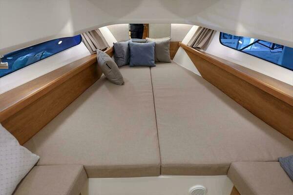 The cockpit is meticulously put together in typical Nimbus fashion, with extra storage compartments and space for three people to sit in the direction of travel. The foredeck offers room for a divan and a sun bed. Much like the T9 series, the T11 also has a large storage hatch at the front of the cabin. Thanks to the large gunwale sides, the foredeck can also be used as a seating area and socializing space. Below deck you will find two separate cabins with space for two couples or a family of four. Additionally, there is a spacious bathroom with toilet, shower and sufficient headroom.