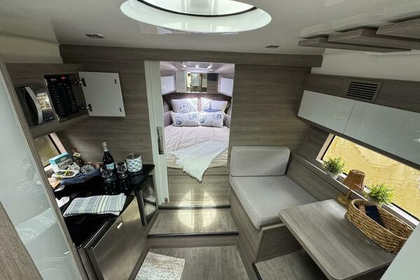 The basements are coated with gel coat for added protection, and the external fuel and water filler caps are conveniently placed for ease of use. Equipped with navigation lights and a complete electrical harness (except for additional electrical or electronic options), this boat is ready for nighttime voyages. Water drainage is managed through a manhole system, ensuring the deck stays dry and clean. External finishing trim in PVC and stainless steel, along with stainless steel cleats, provide a refined look and durability. Additionally, LED floor lighting enhances the ambiance, making this yacht as beautiful at night as it is during the day.